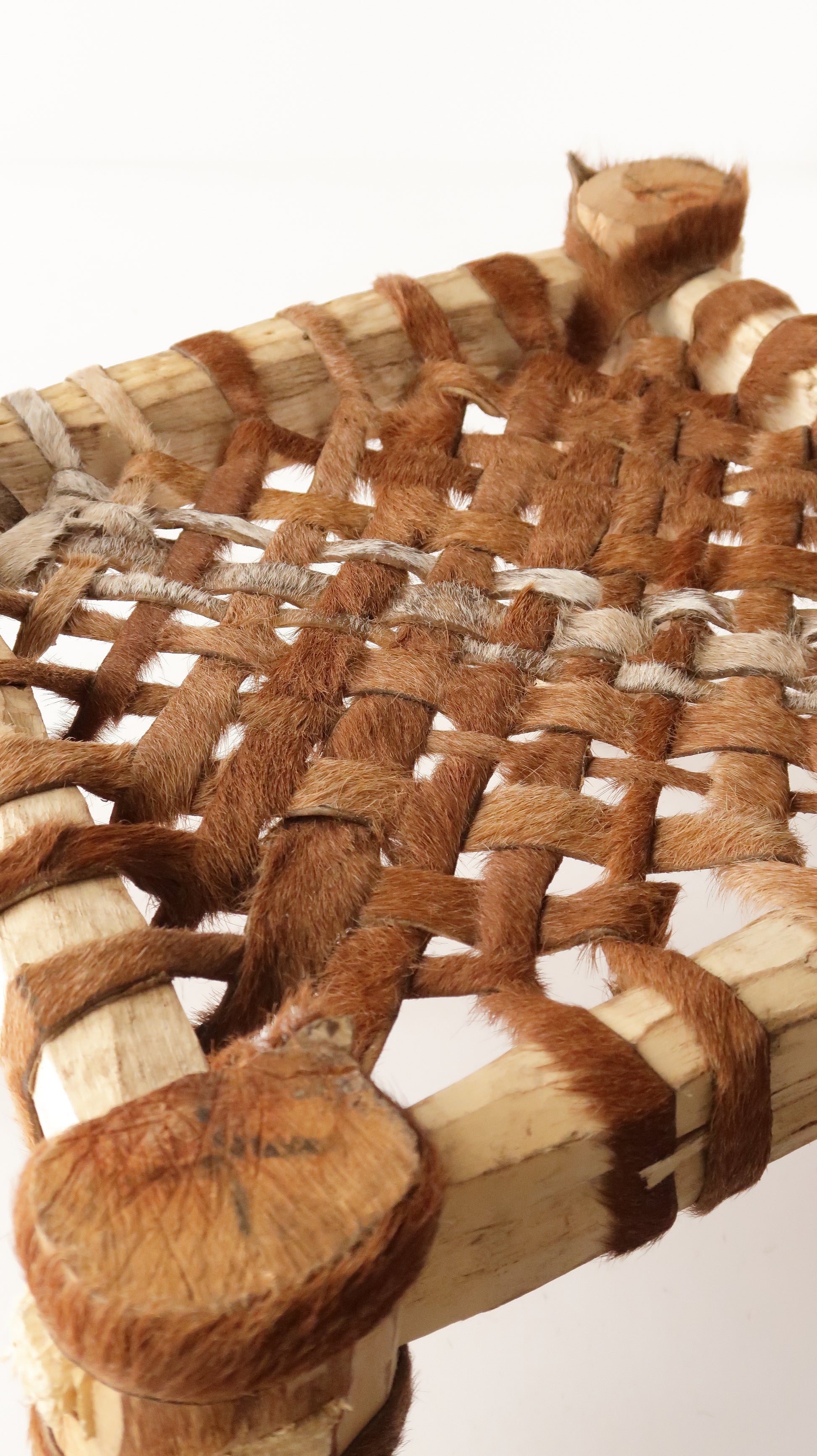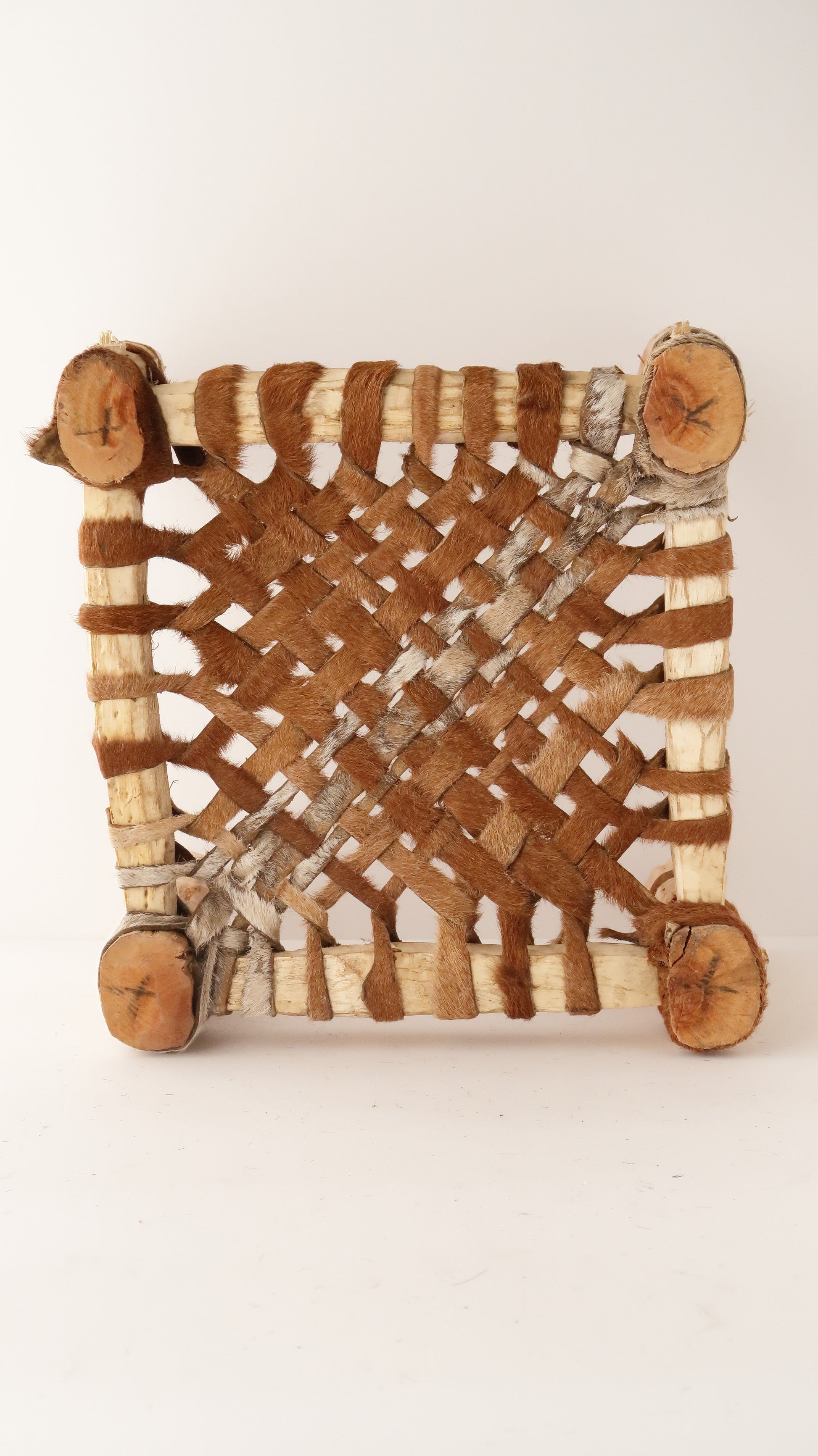 座面は毛を残した山羊の革が網目状に編まれています。現地ではこれがもっと大きくなるとベッドや三人掛けベンチなどになり、町の食堂で使われているのをよく見かけました。