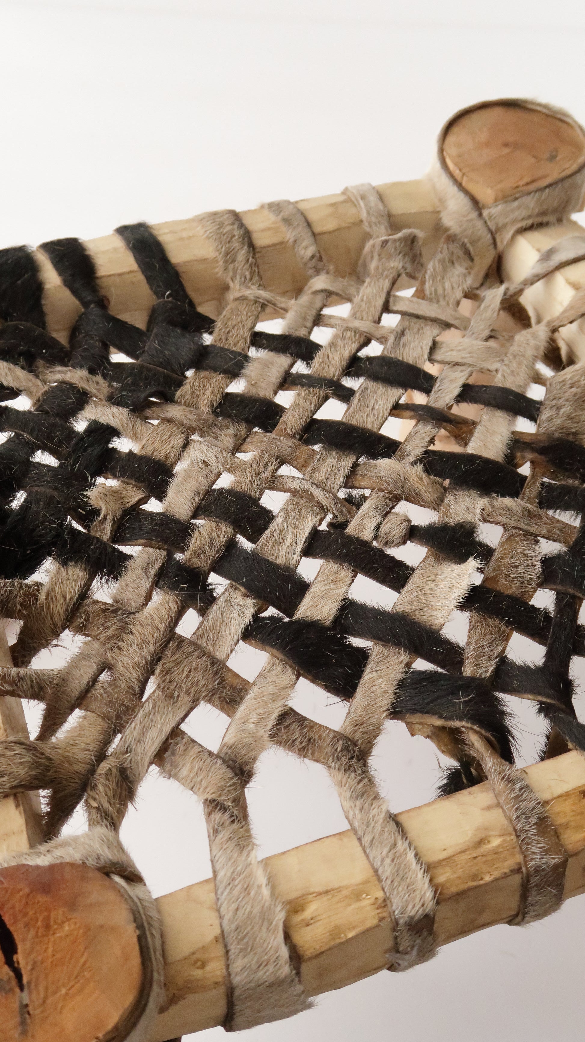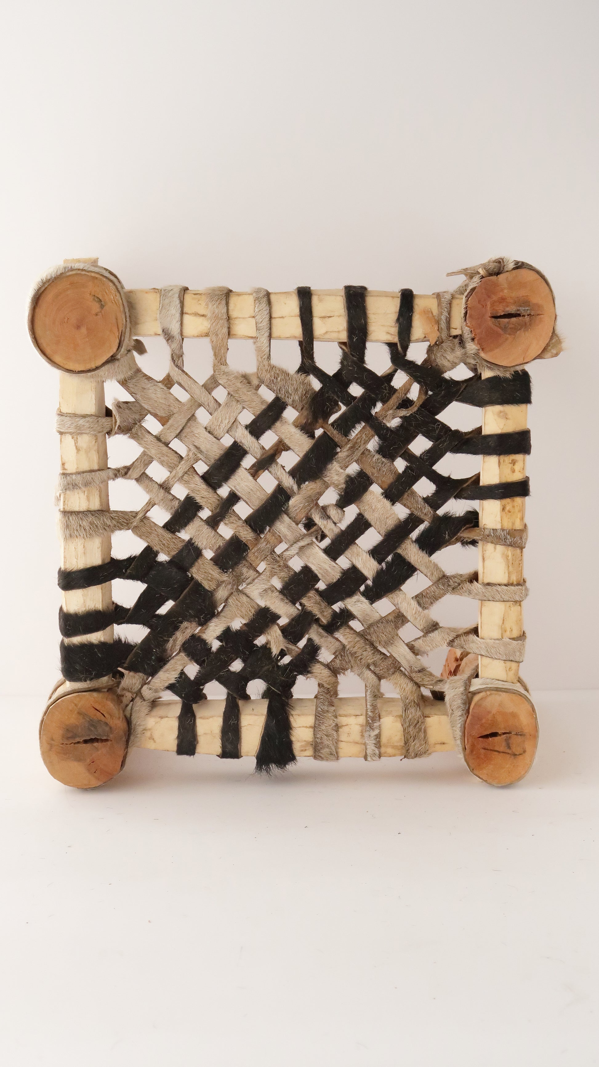 座面は毛を残した山羊の革が網目状に編まれています。現地ではこれがもっと大きくなるとベッドや三人掛けベンチなどになり、町の食堂で使われているのをよく見かけました。
