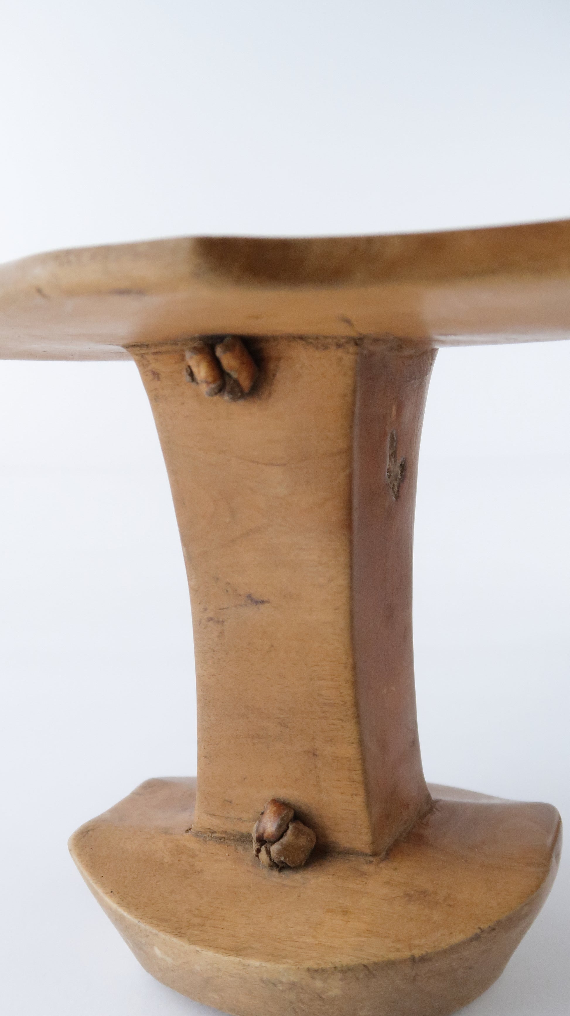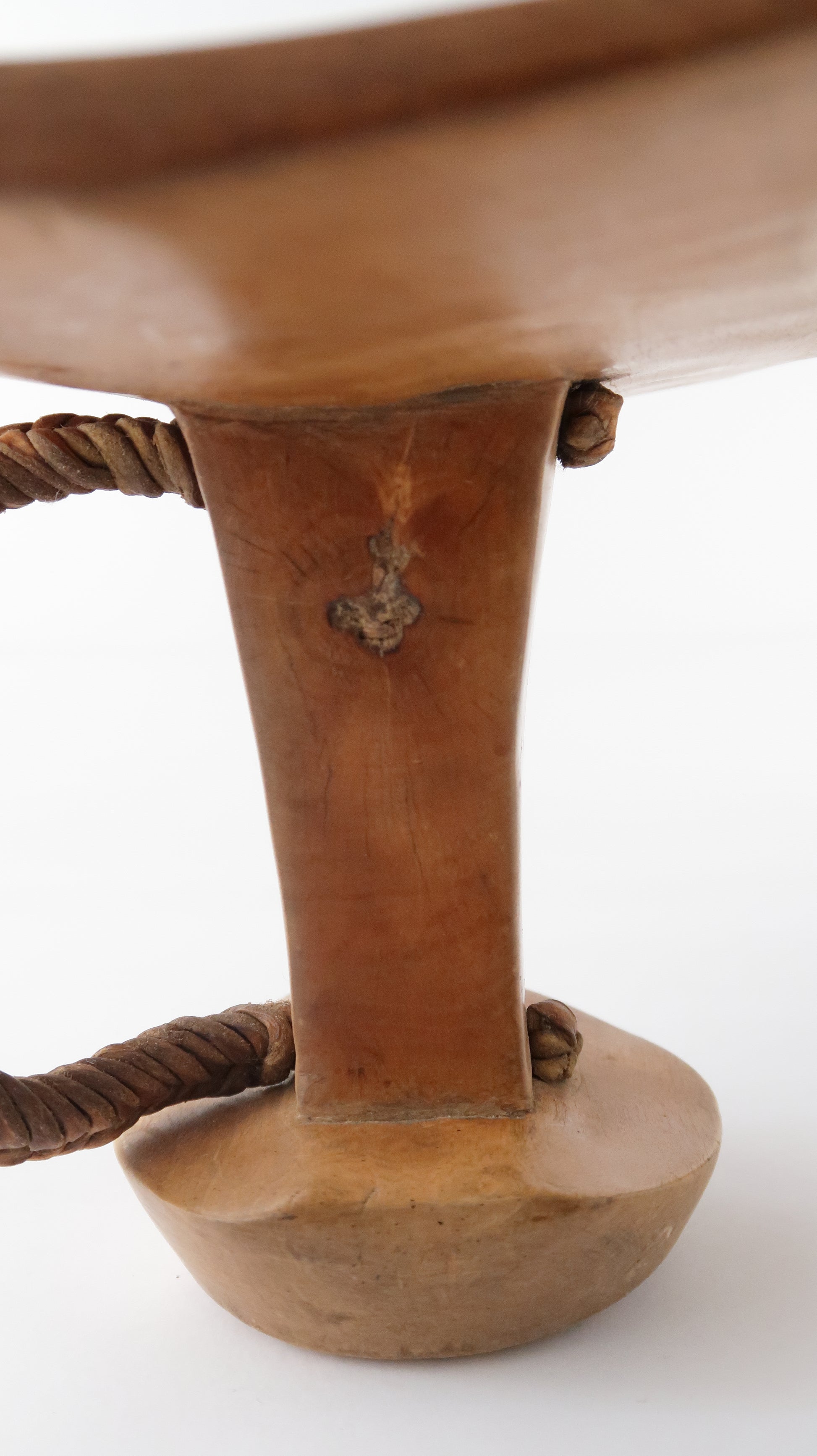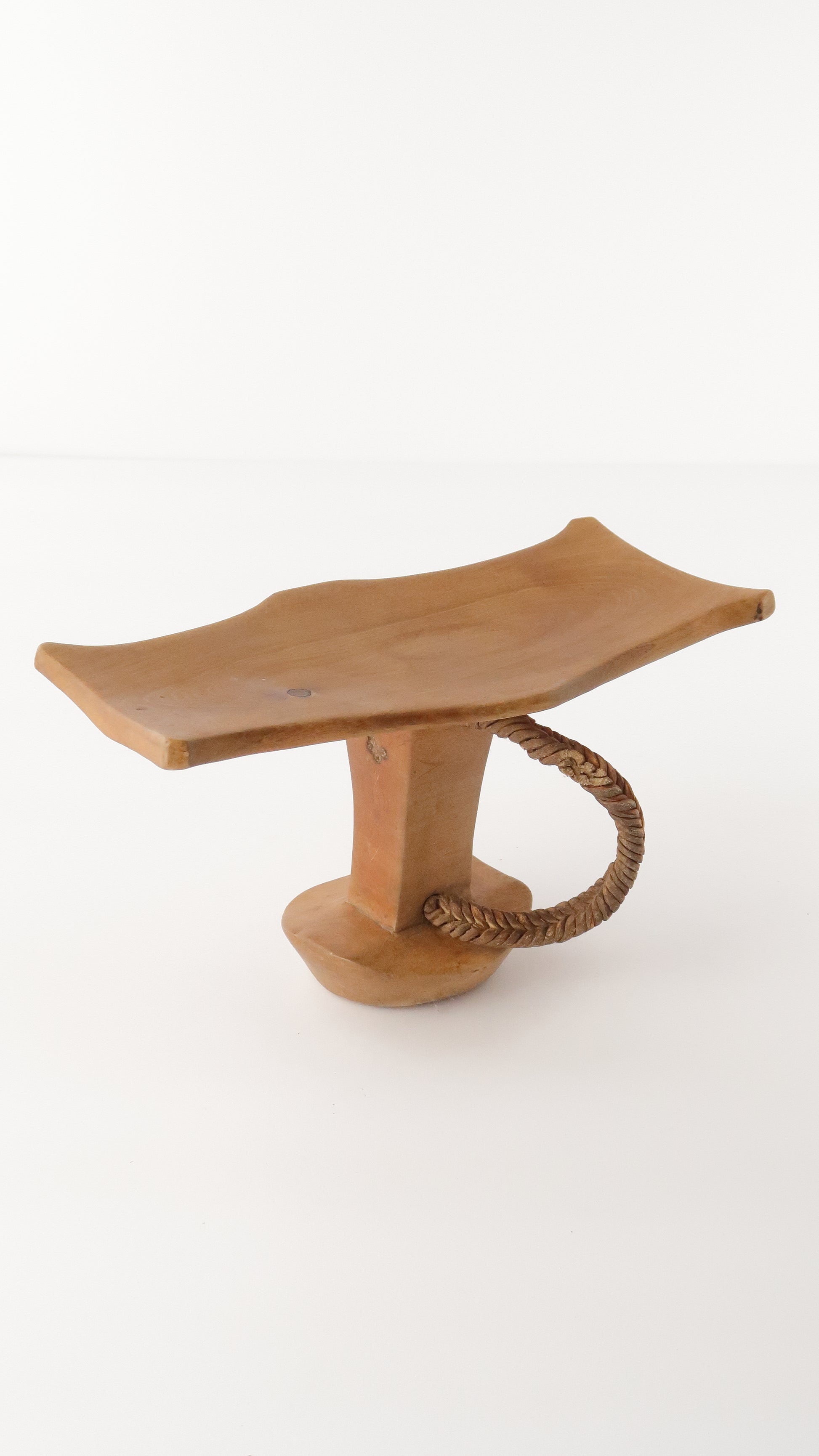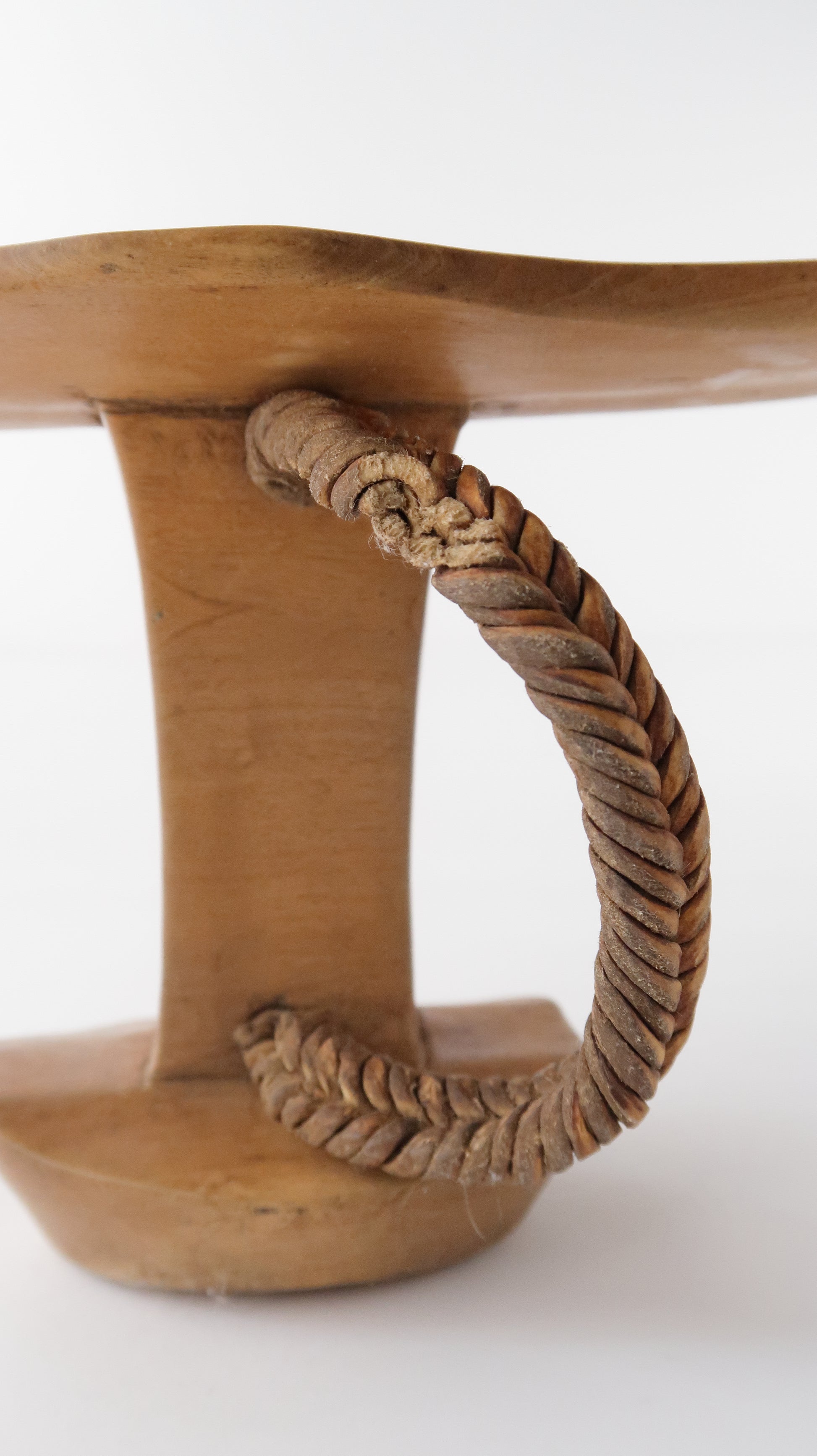 こちらはニャンガトムの人たちの枕です。革で編まれている紐がついているのですが、一部破損しています。お手本のようなとても綺麗な彫りの一点です。