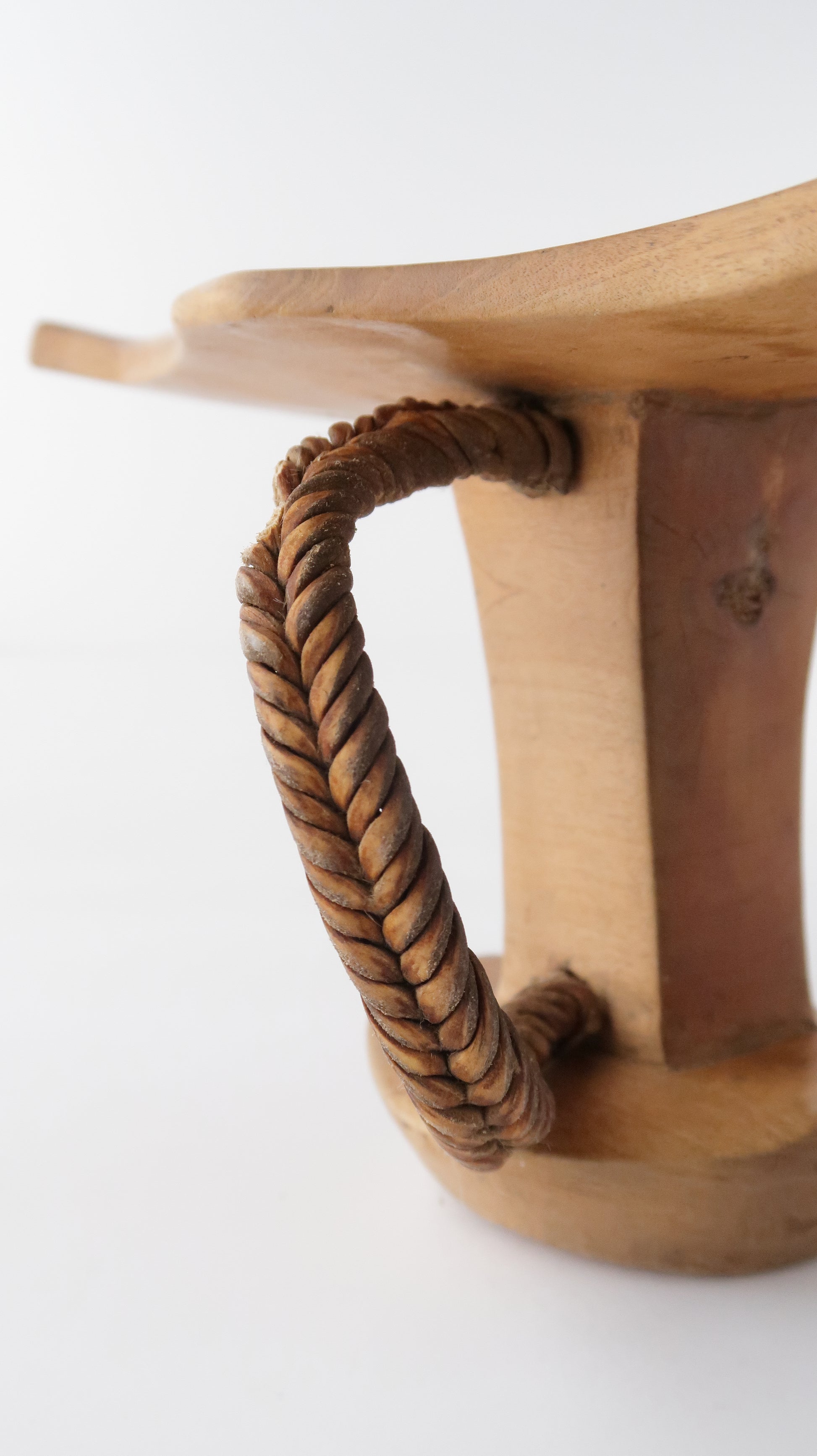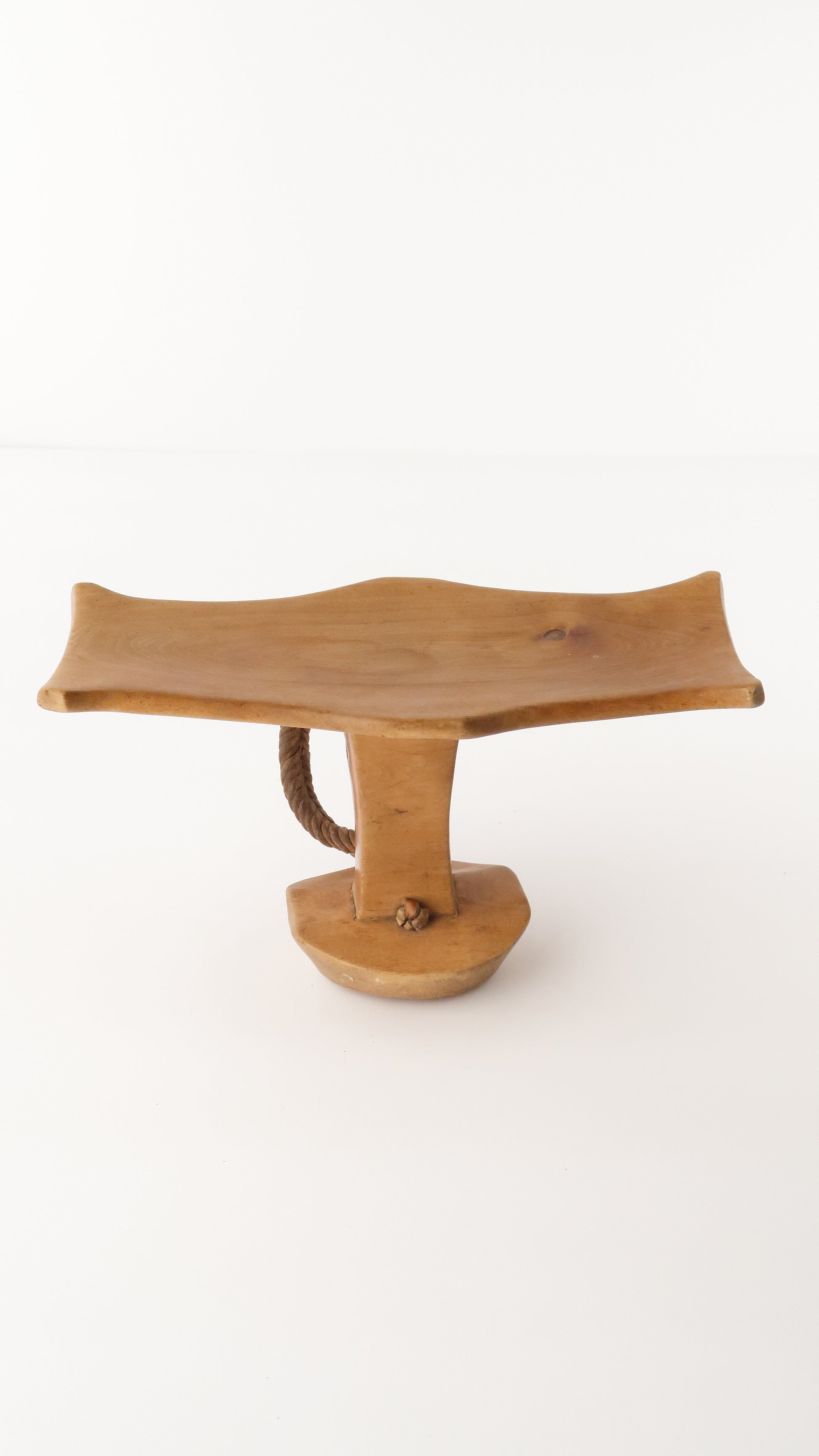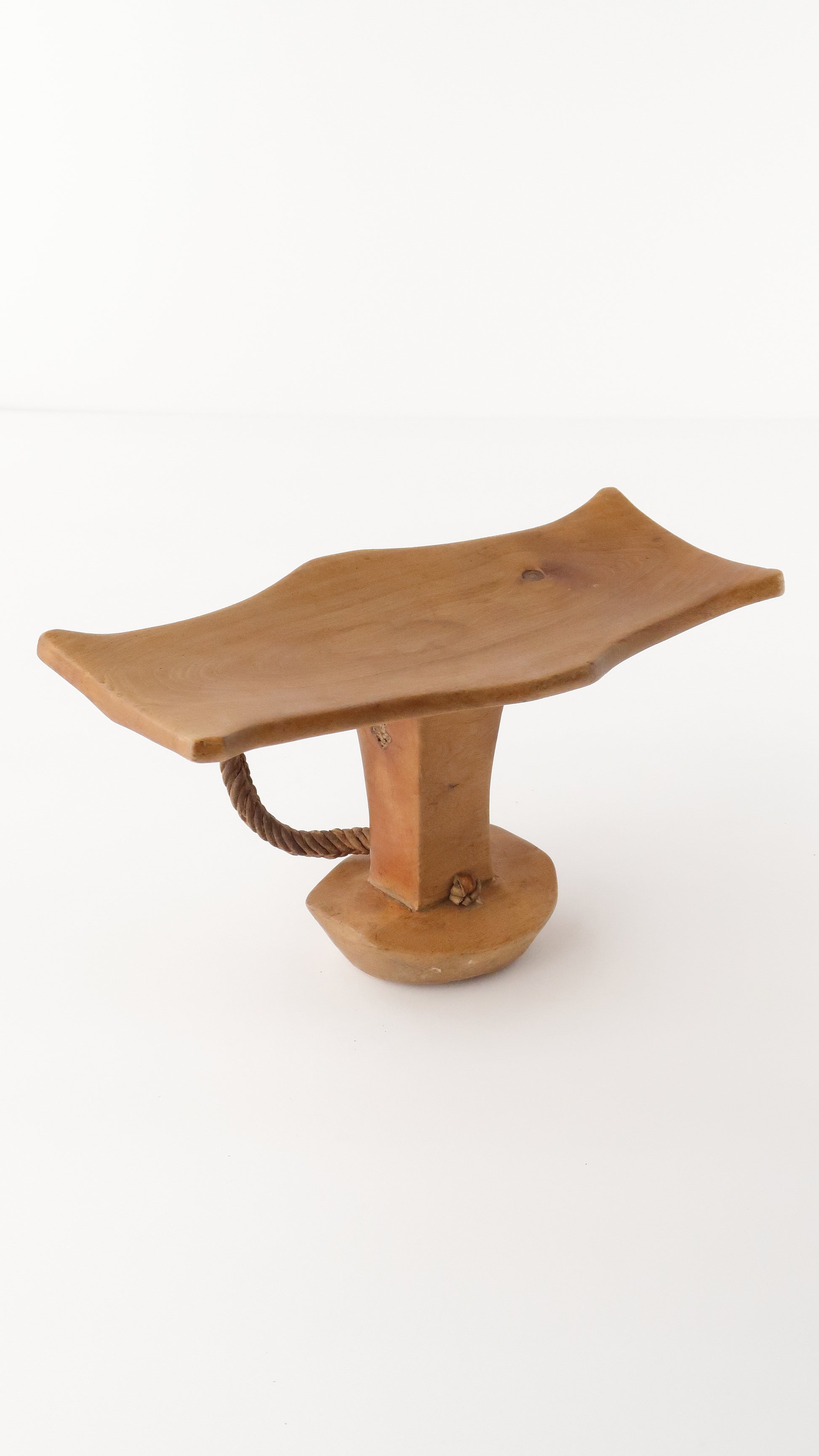 こちらはニャンガトムの人たちの枕です。革で編まれている紐がついているのですが、一部破損しています。お手本のようなとても綺麗な彫りの一点です。
