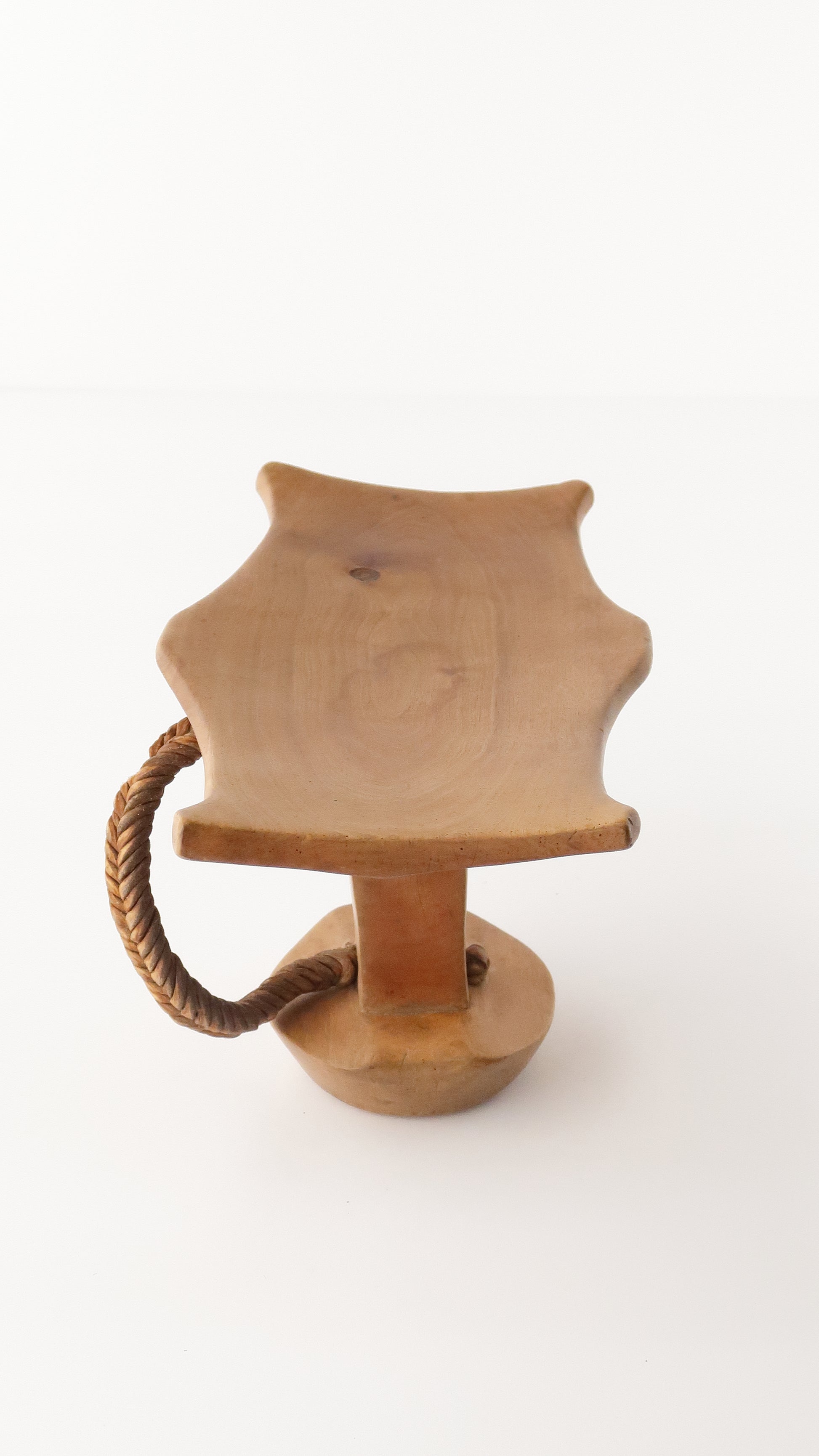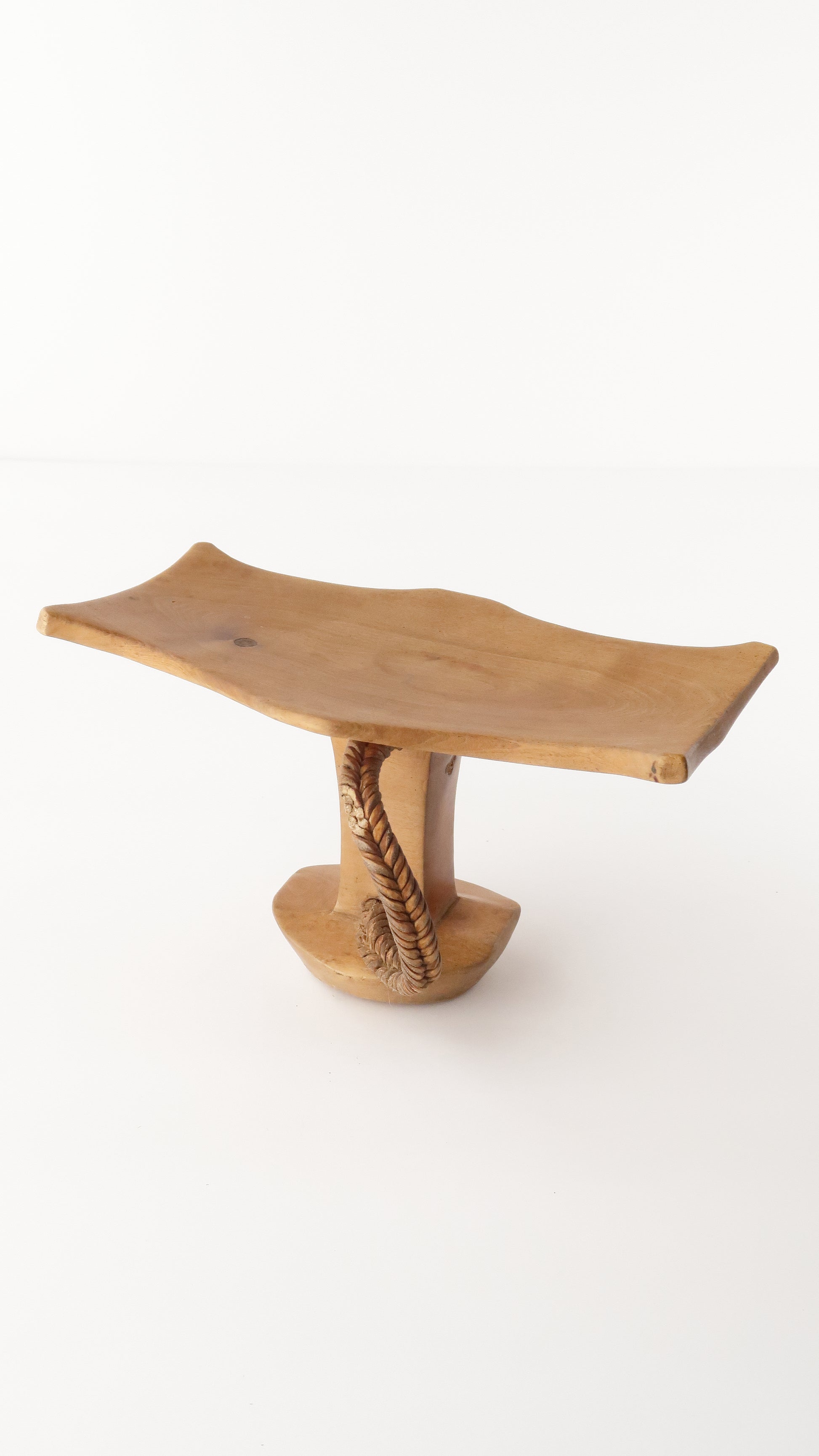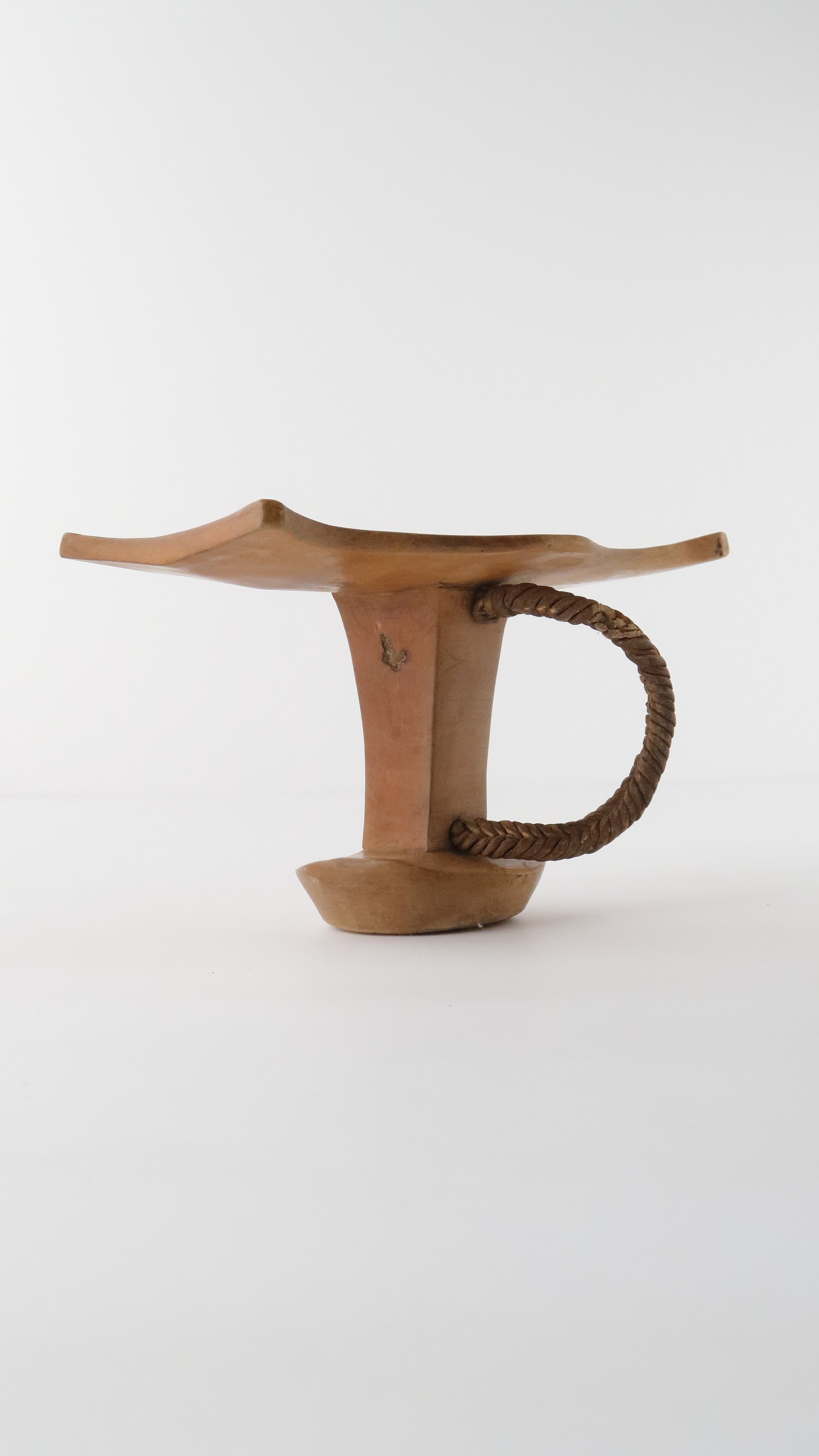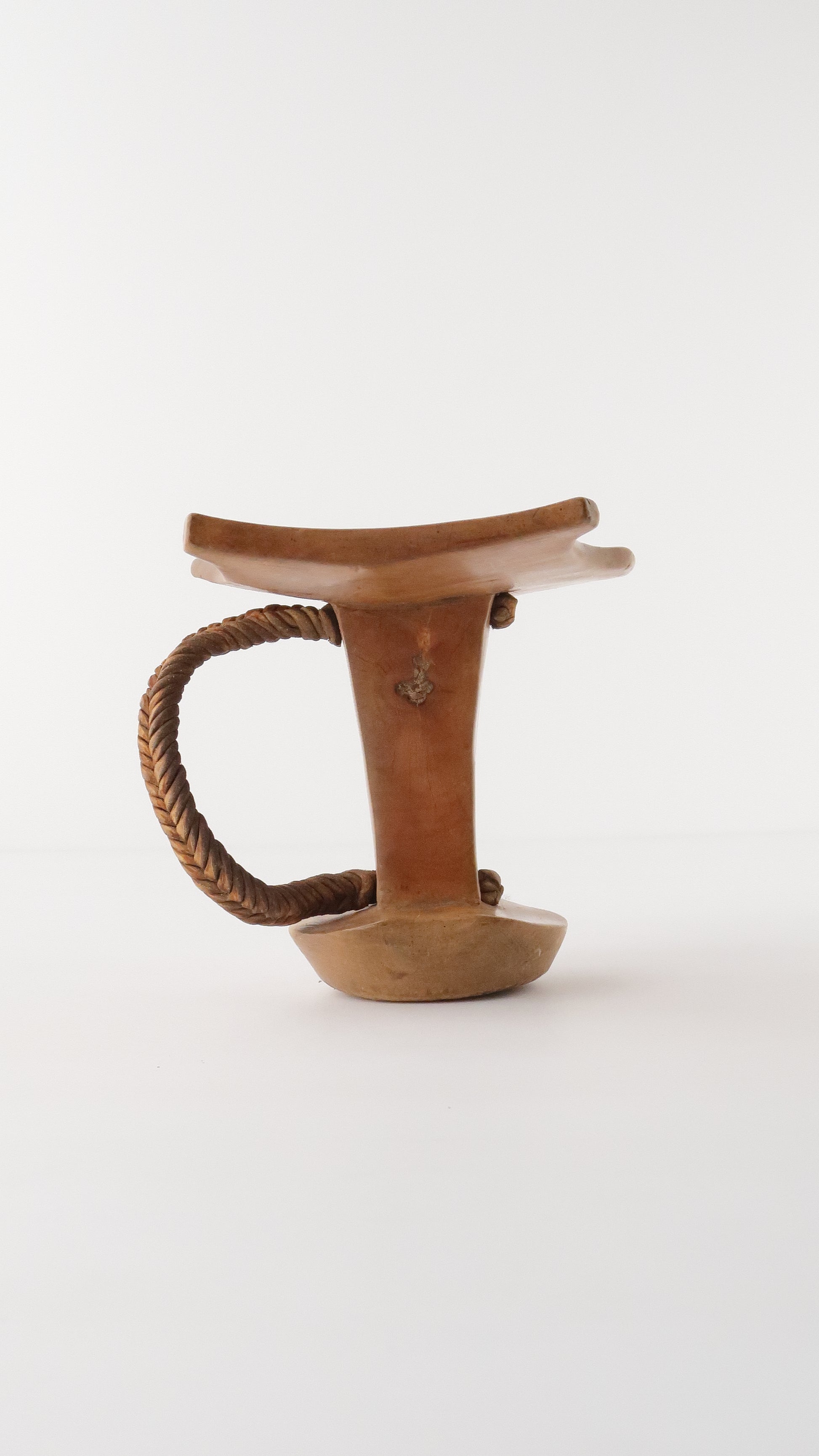 こちらはニャンガトムの人たちの枕です。革で編まれている紐がついているのですが、一部破損しています。お手本のようなとても綺麗な彫りの一点です。