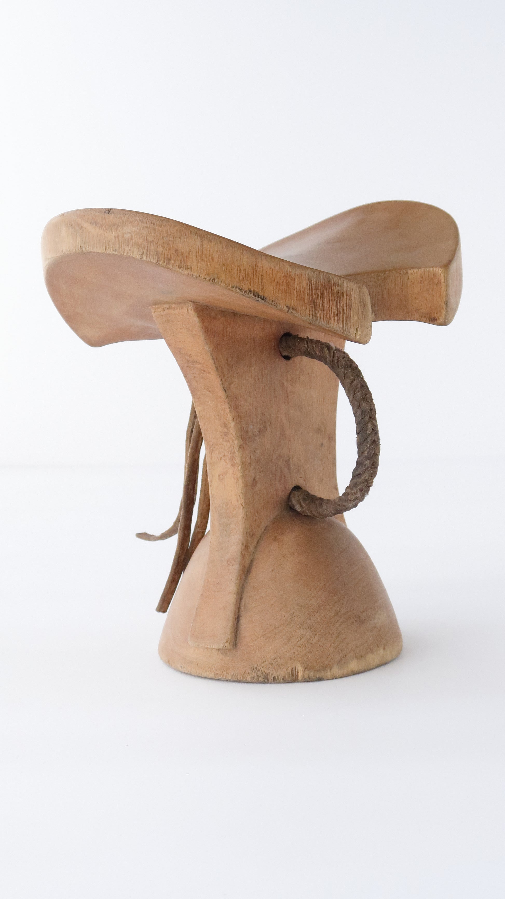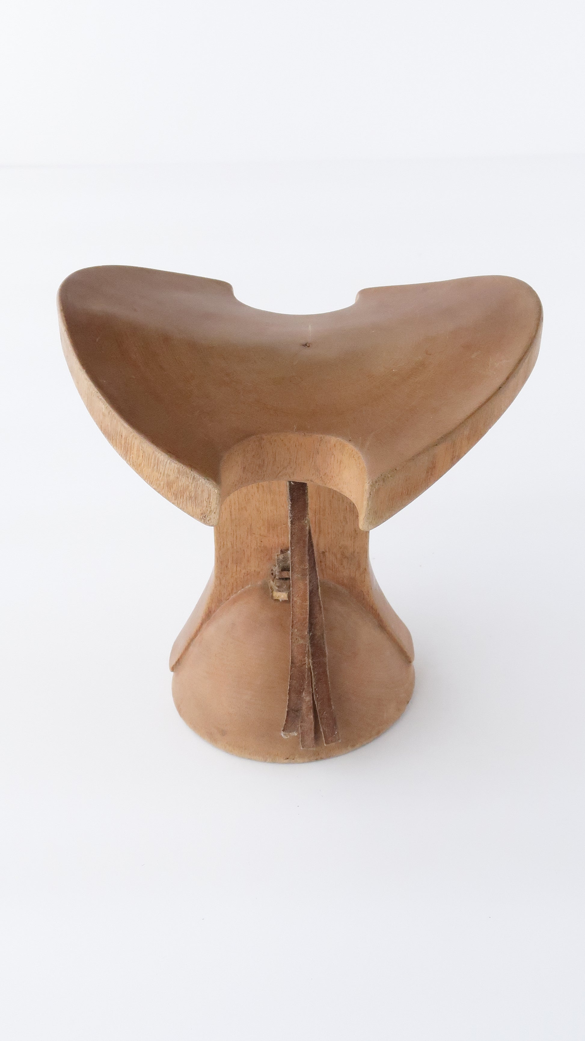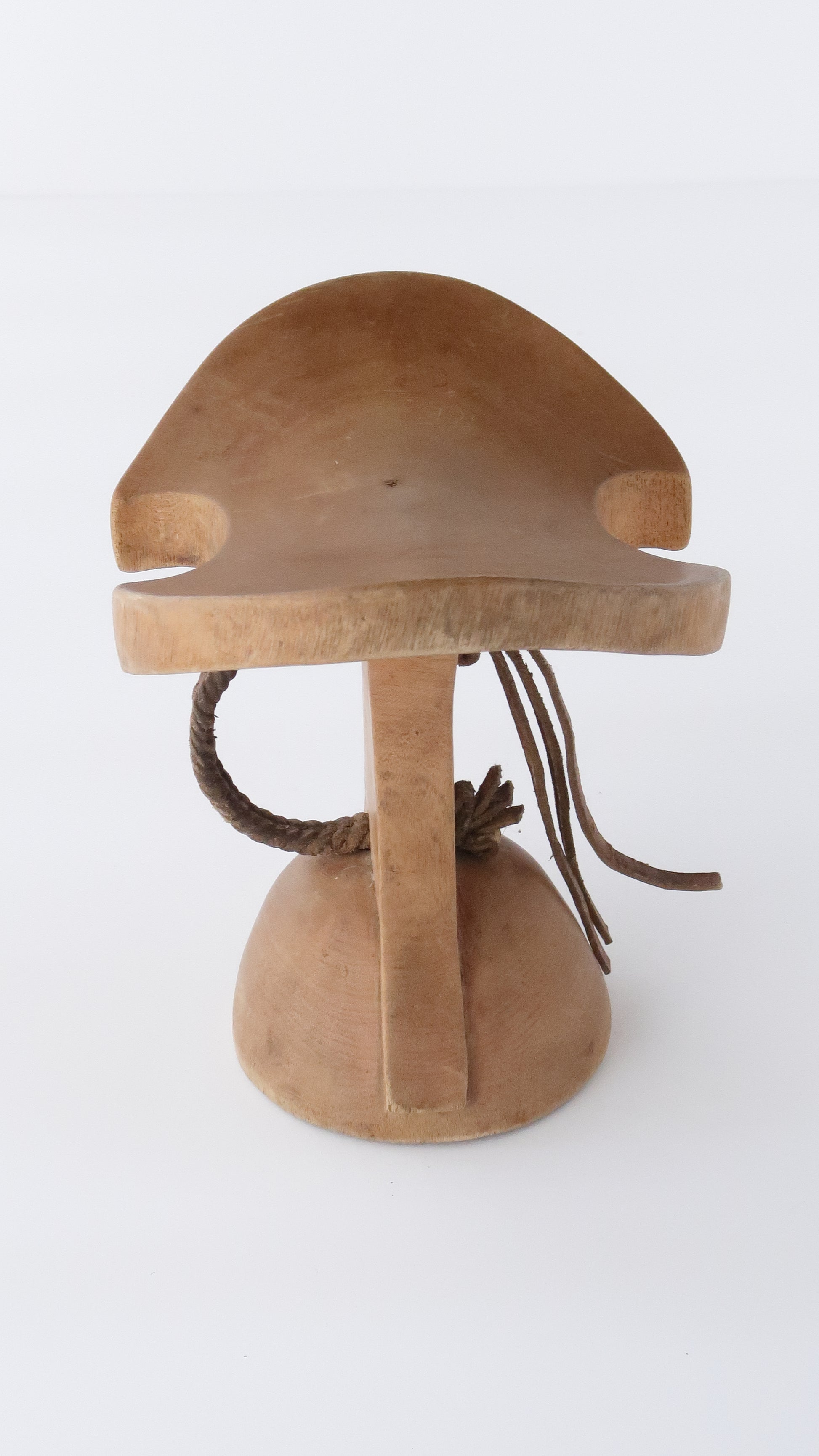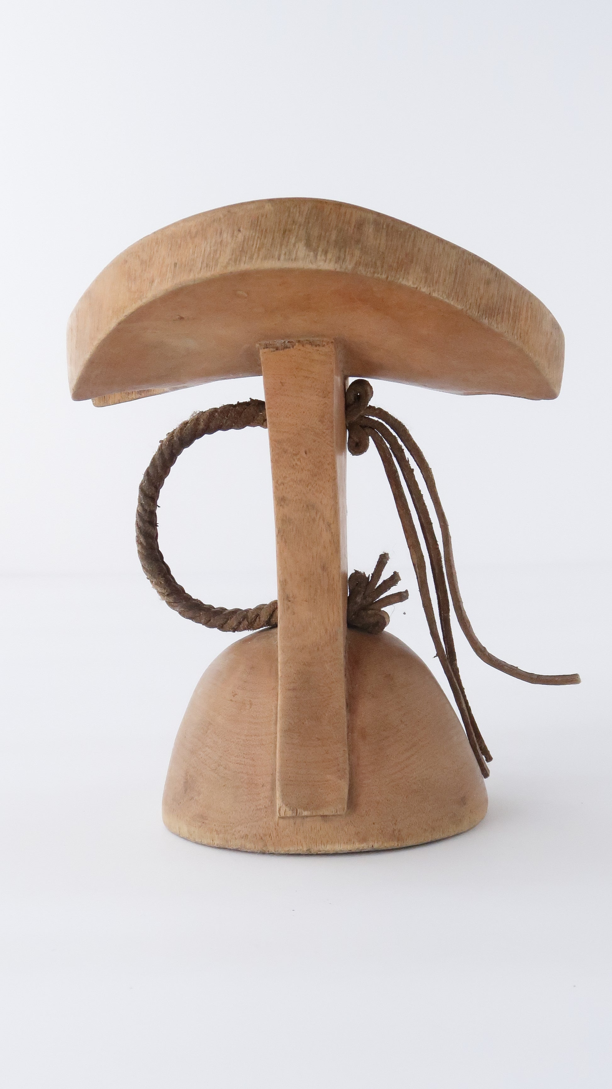 こちらはハマールの人たちかバンナの人たちの枕です。全体的に丸みを帯びた形がとても可愛らしいです。革紐がついているのも良いですね。座面の中心から木の年輪が広がっているのも素敵です。