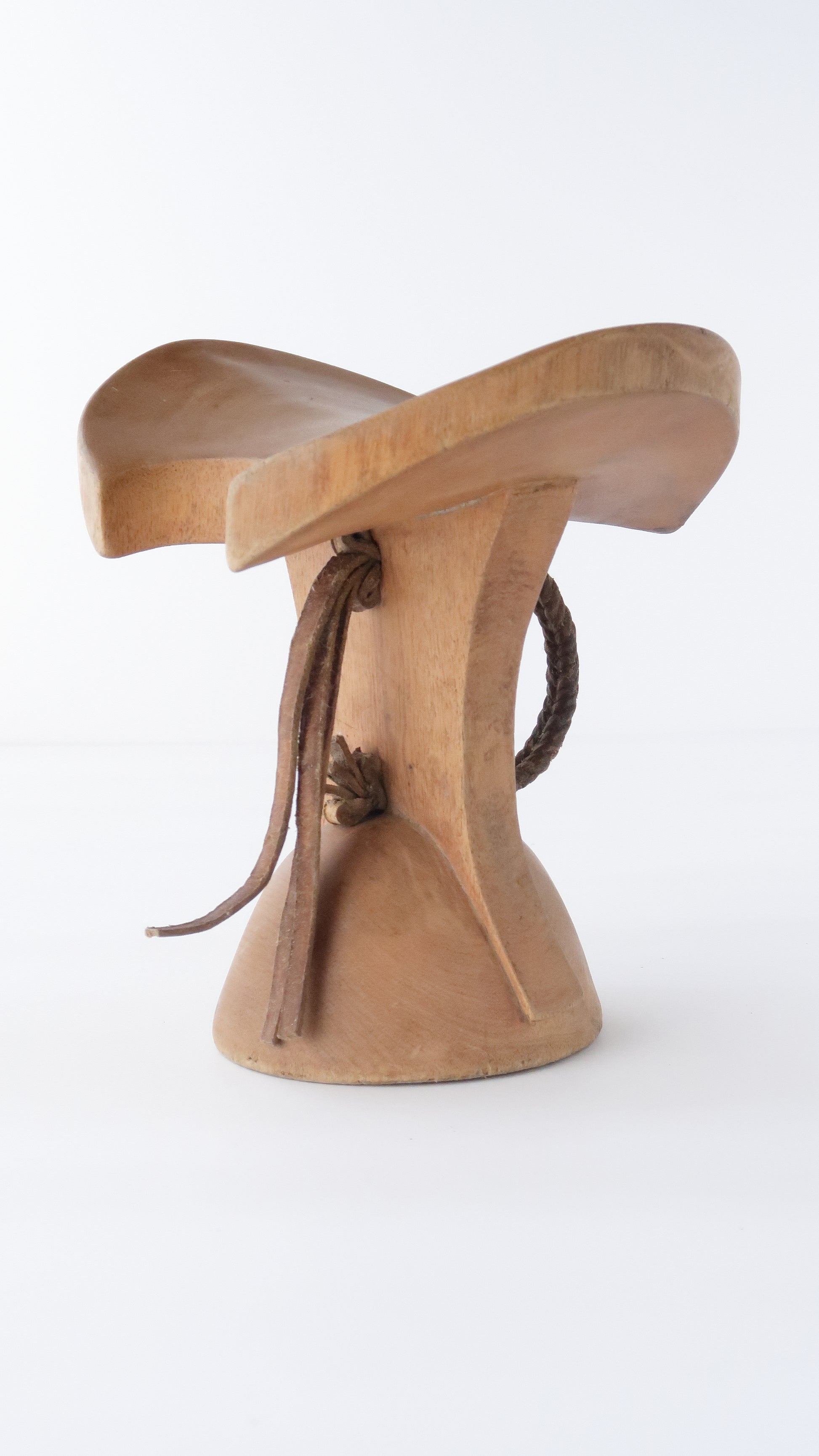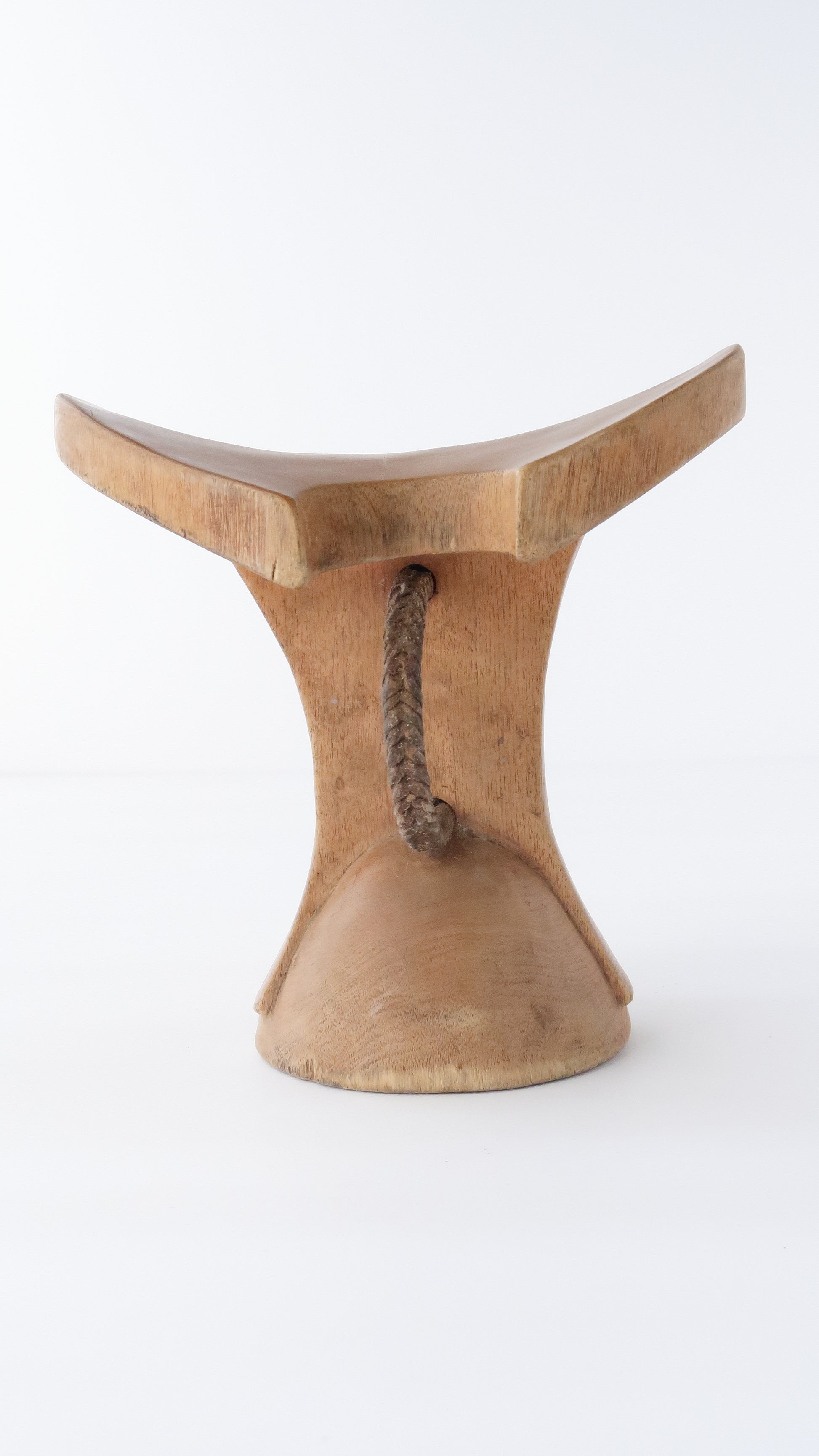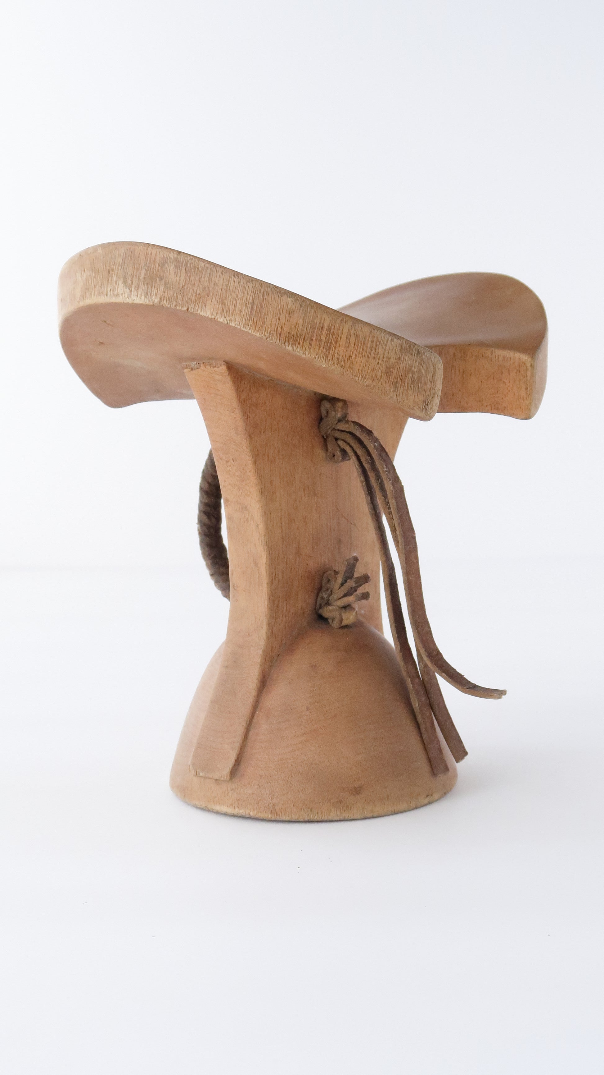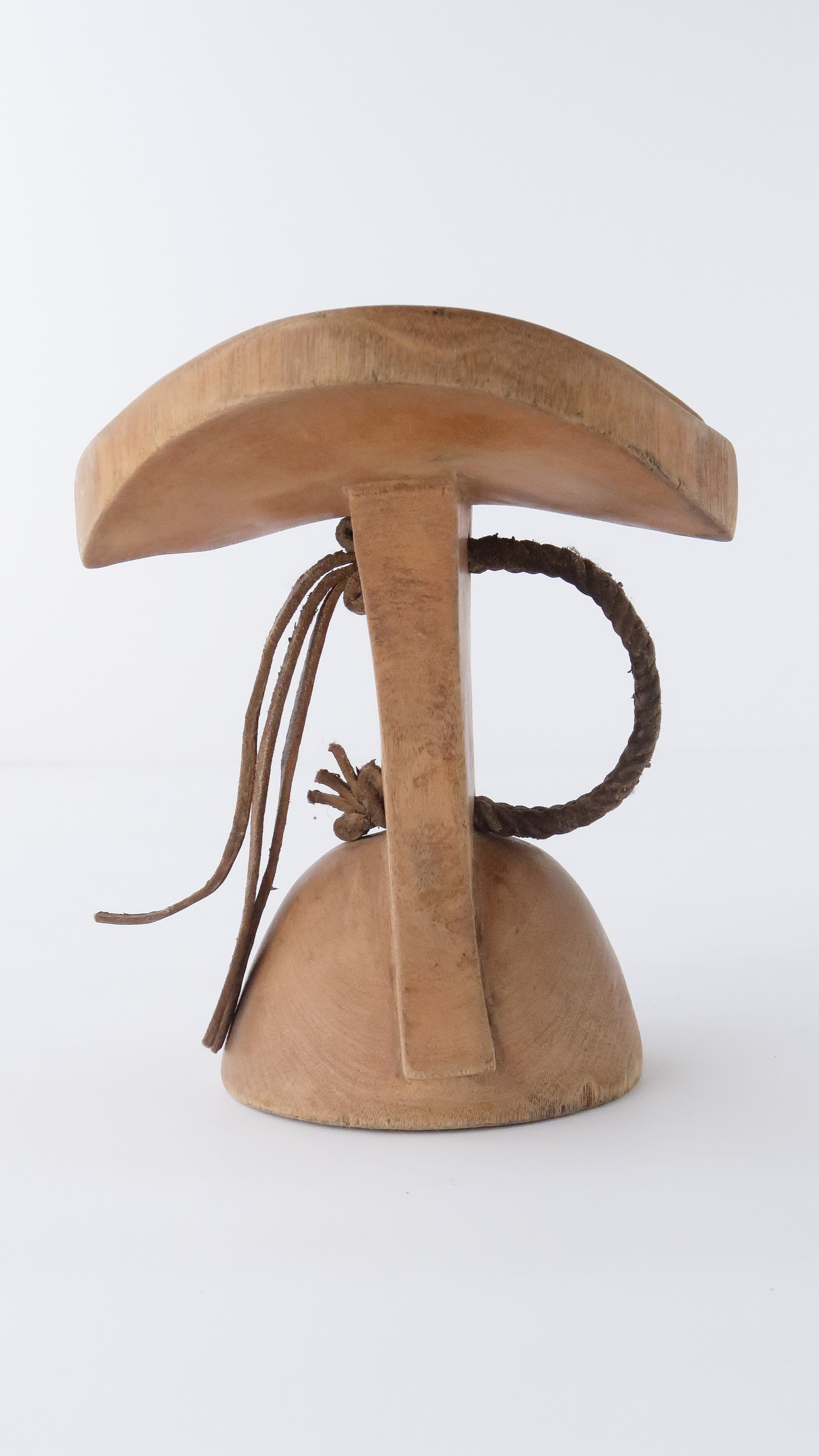 こちらはハマールの人たちかバンナの人たちの枕です。全体的に丸みを帯びた形がとても可愛らしいです。革紐がついているのも良いですね。座面の中心から木の年輪が広がっているのも素敵です。