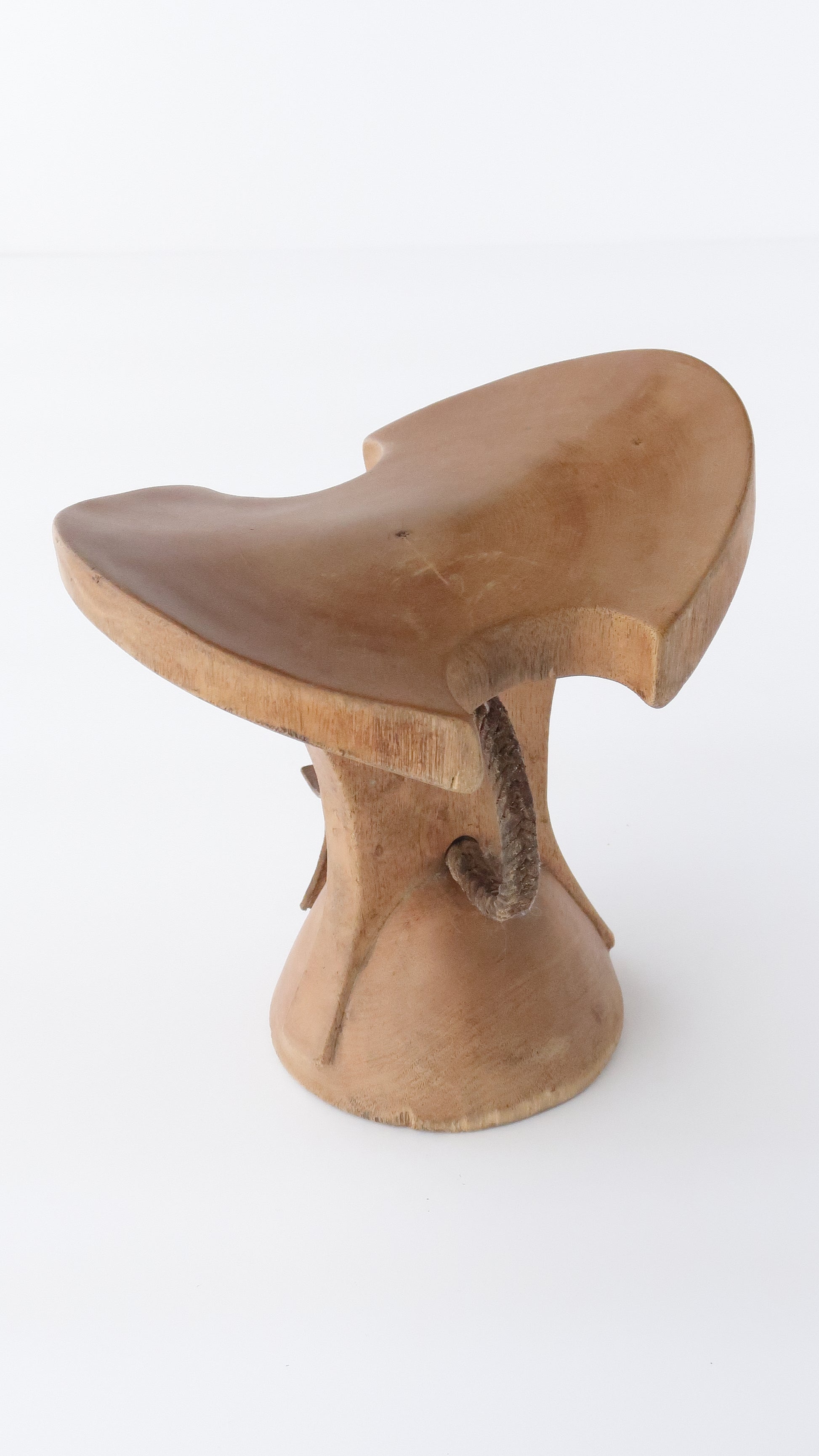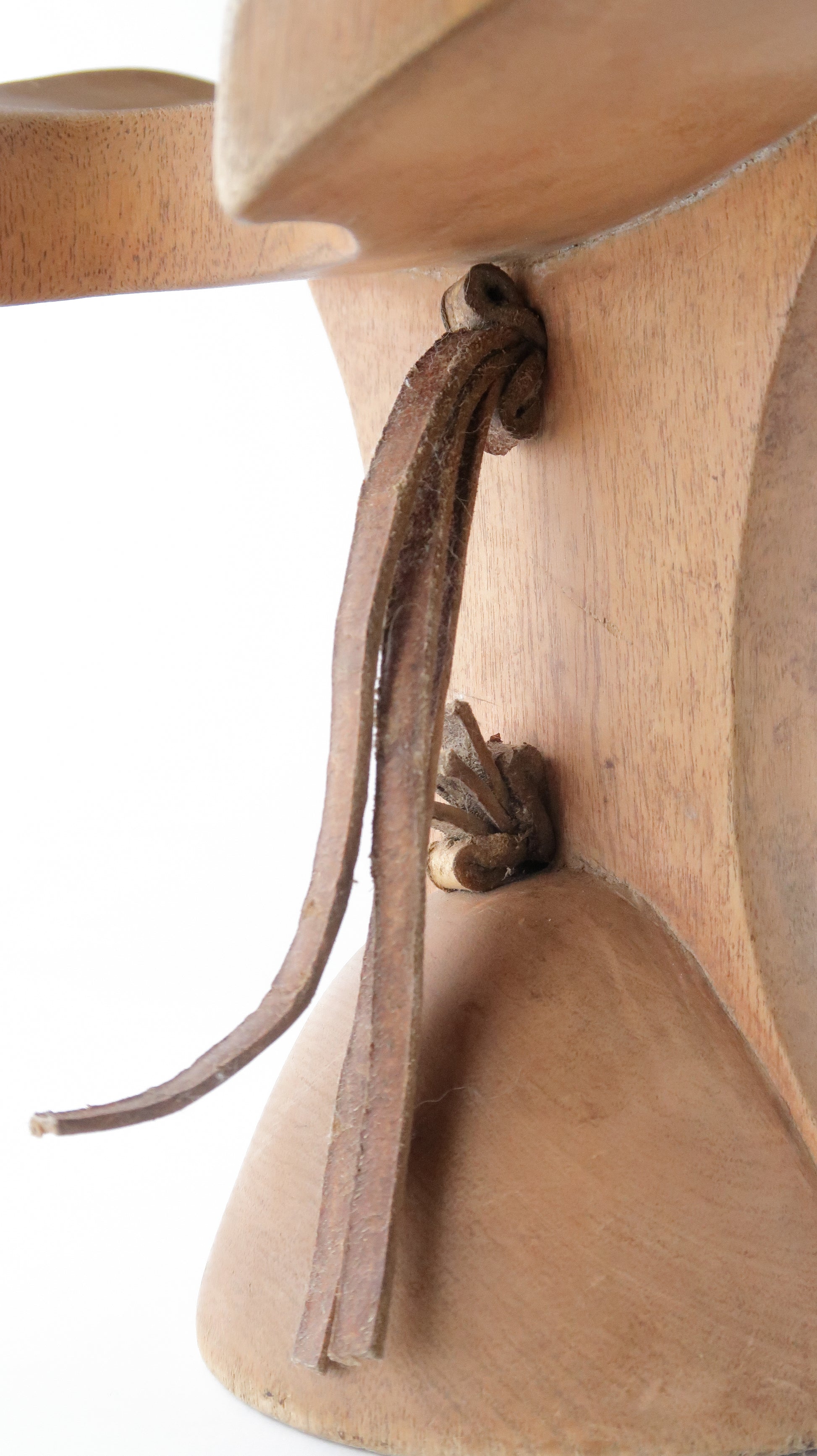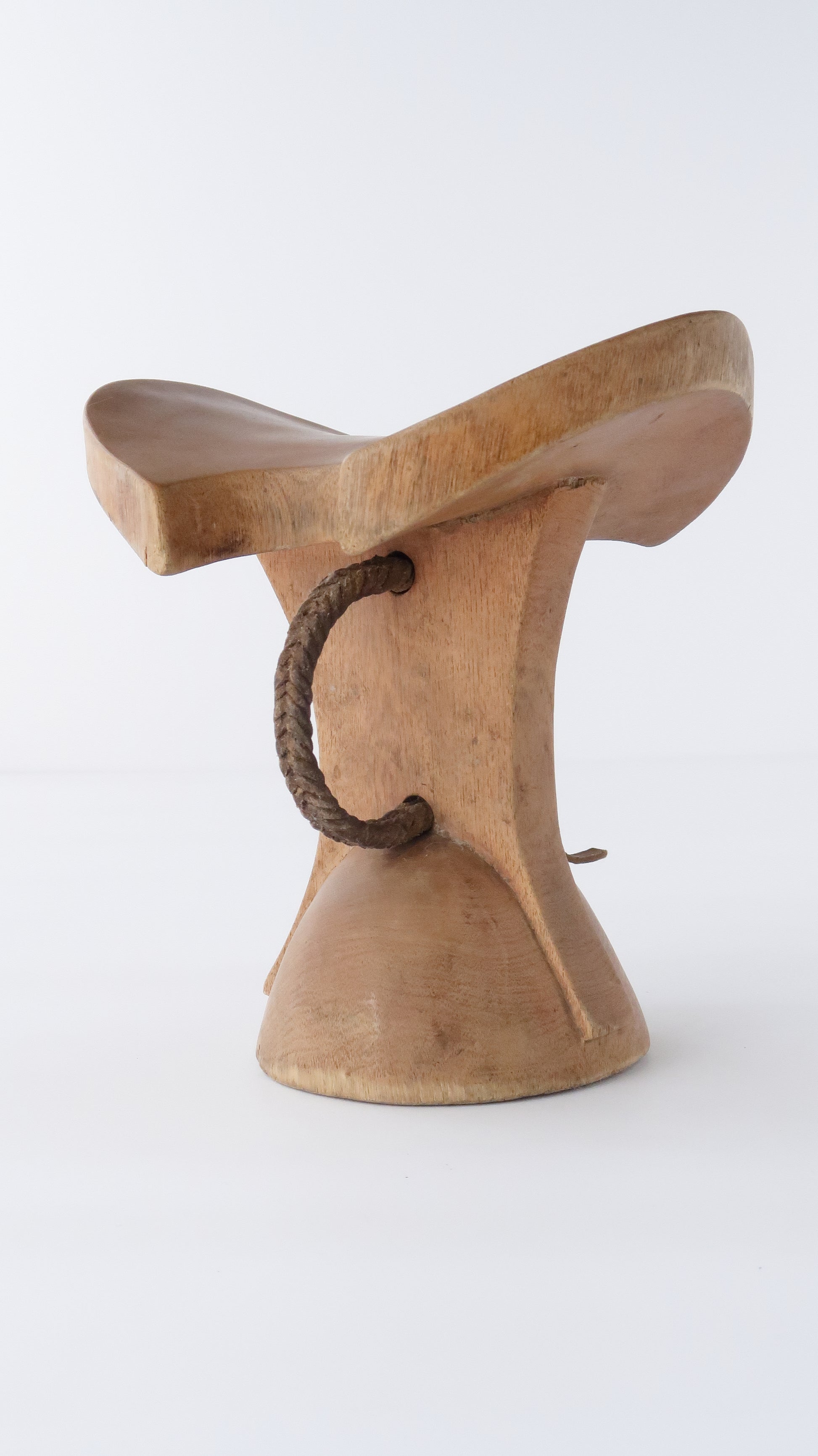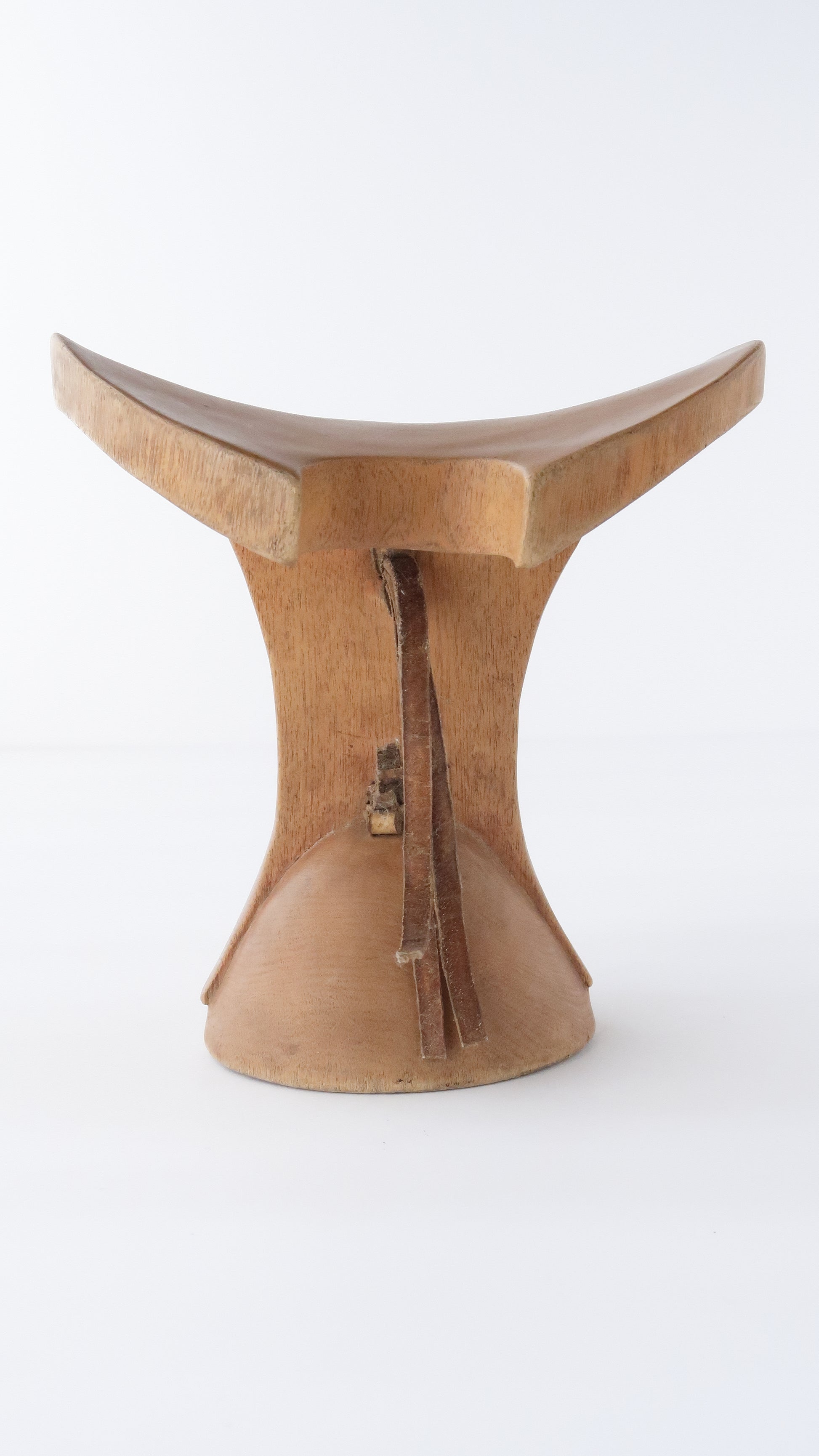 こちらはハマールの人たちかバンナの人たちの枕です。全体的に丸みを帯びた形がとても可愛らしいです。革紐がついているのも良いですね。座面の中心から木の年輪が広がっているのも素敵です。