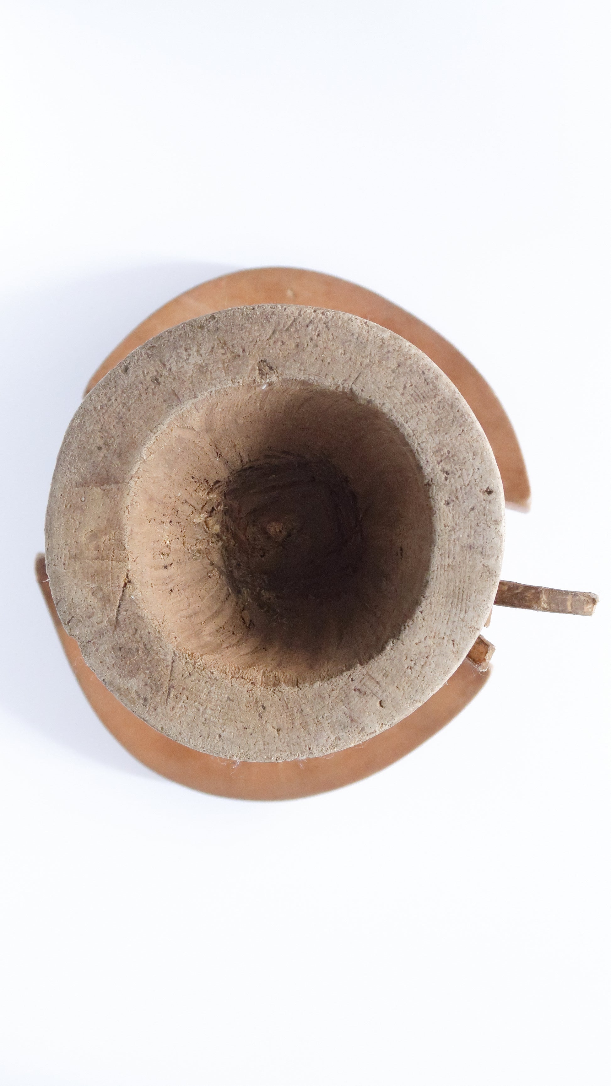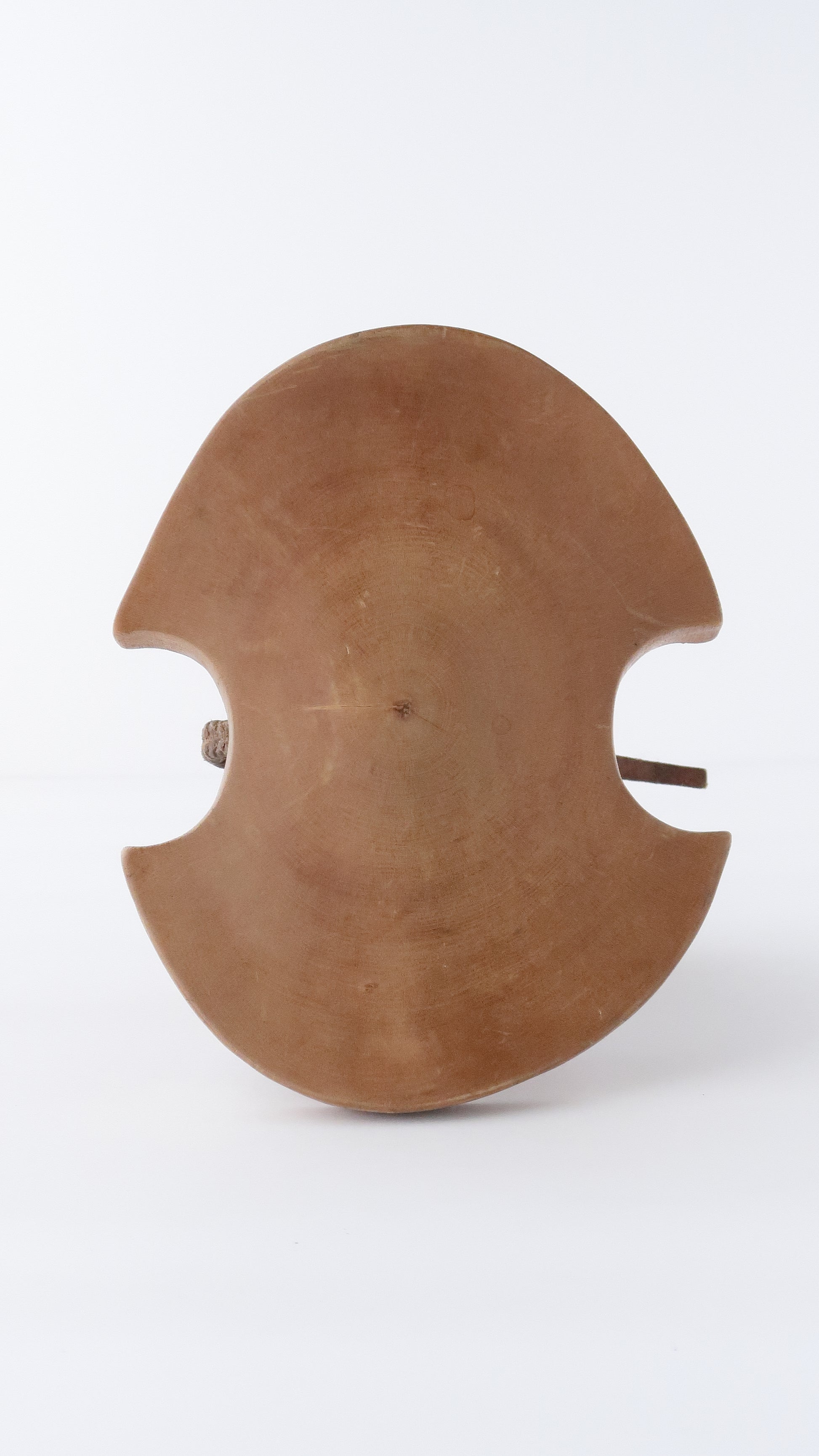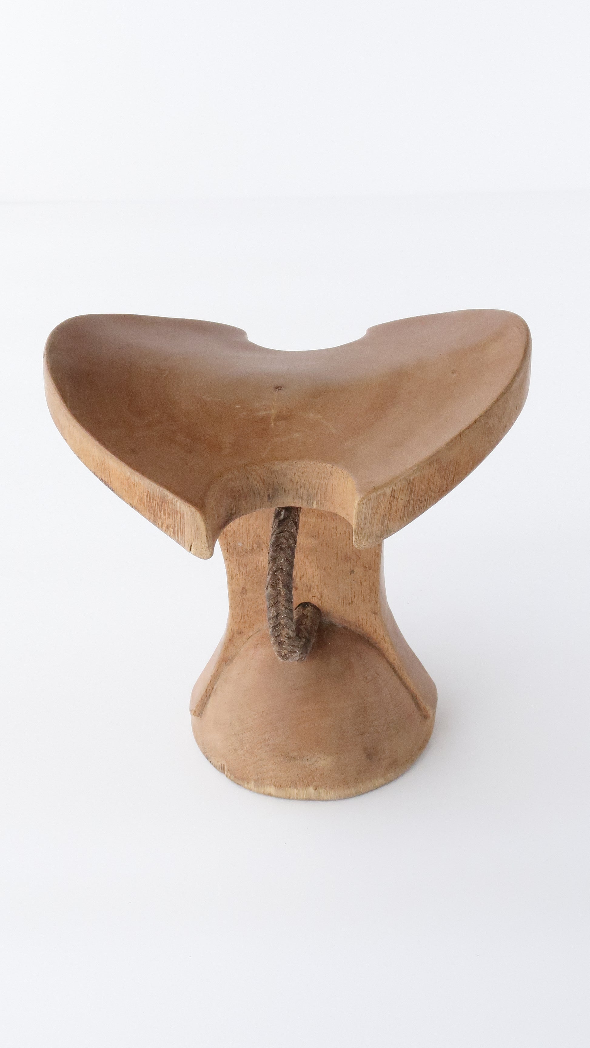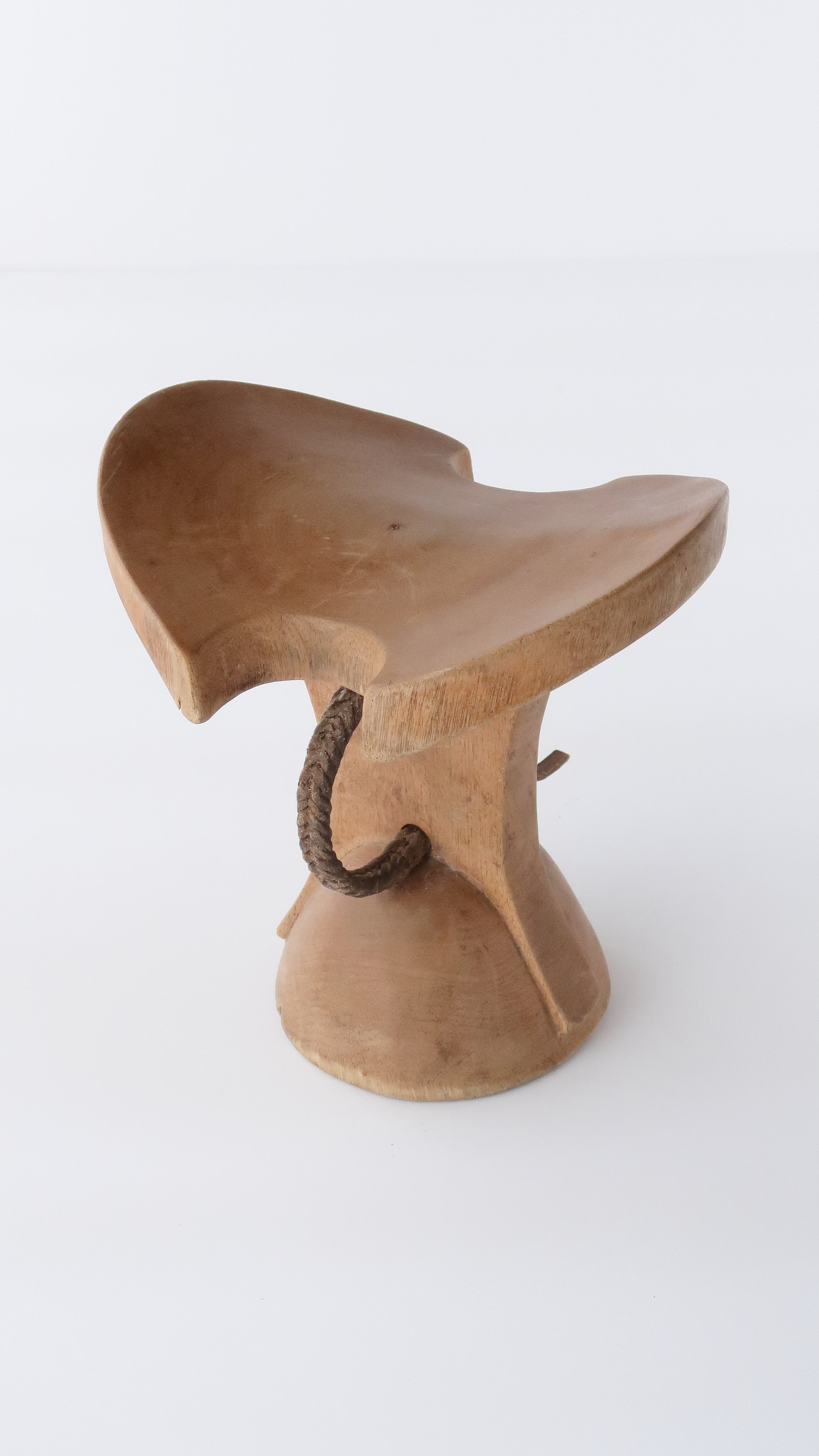 こちらはハマールの人たちかバンナの人たちの枕です。全体的に丸みを帯びた形がとても可愛らしいです。革紐がついているのも良いですね。座面の中心から木の年輪が広がっているのも素敵です。