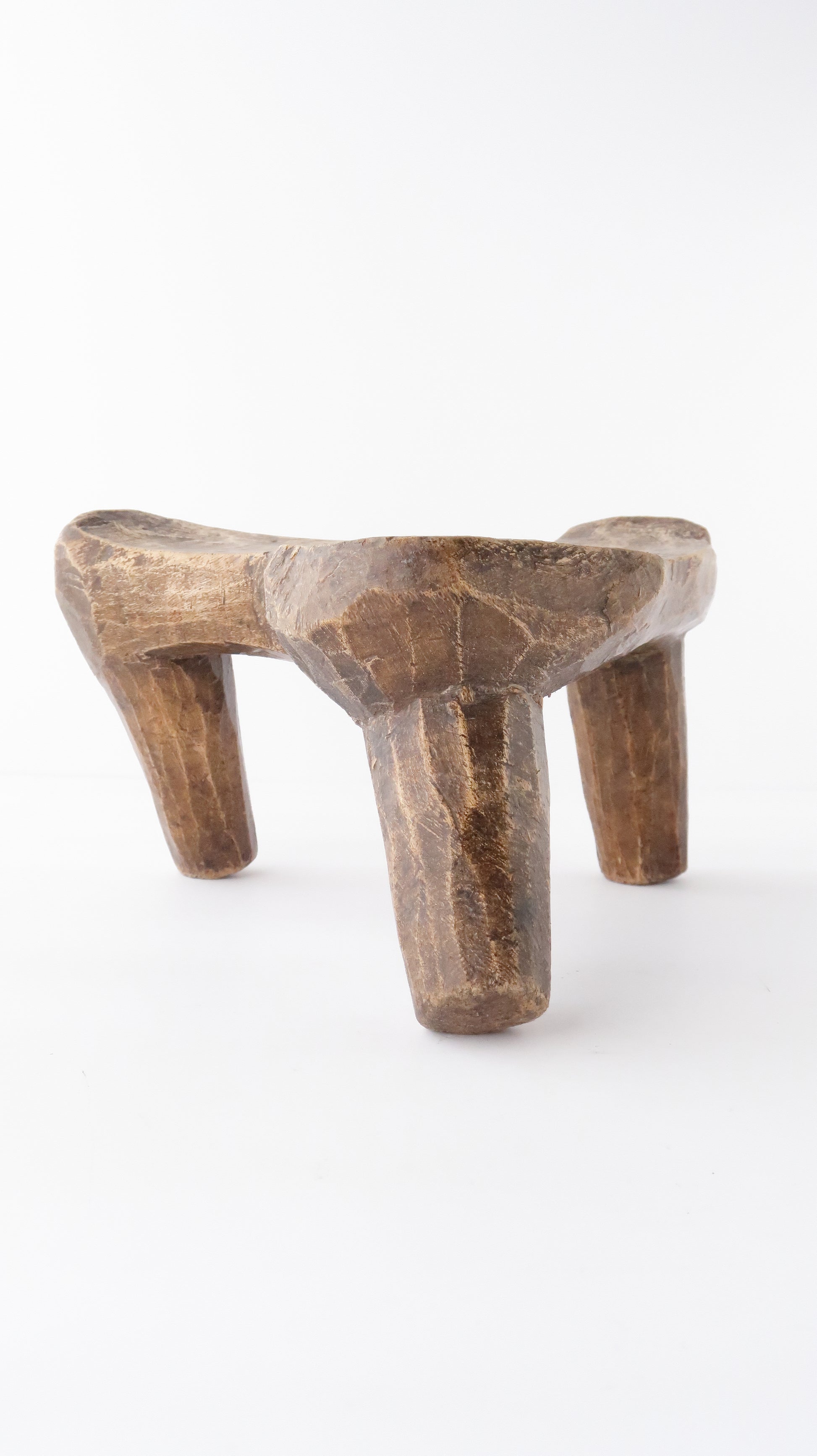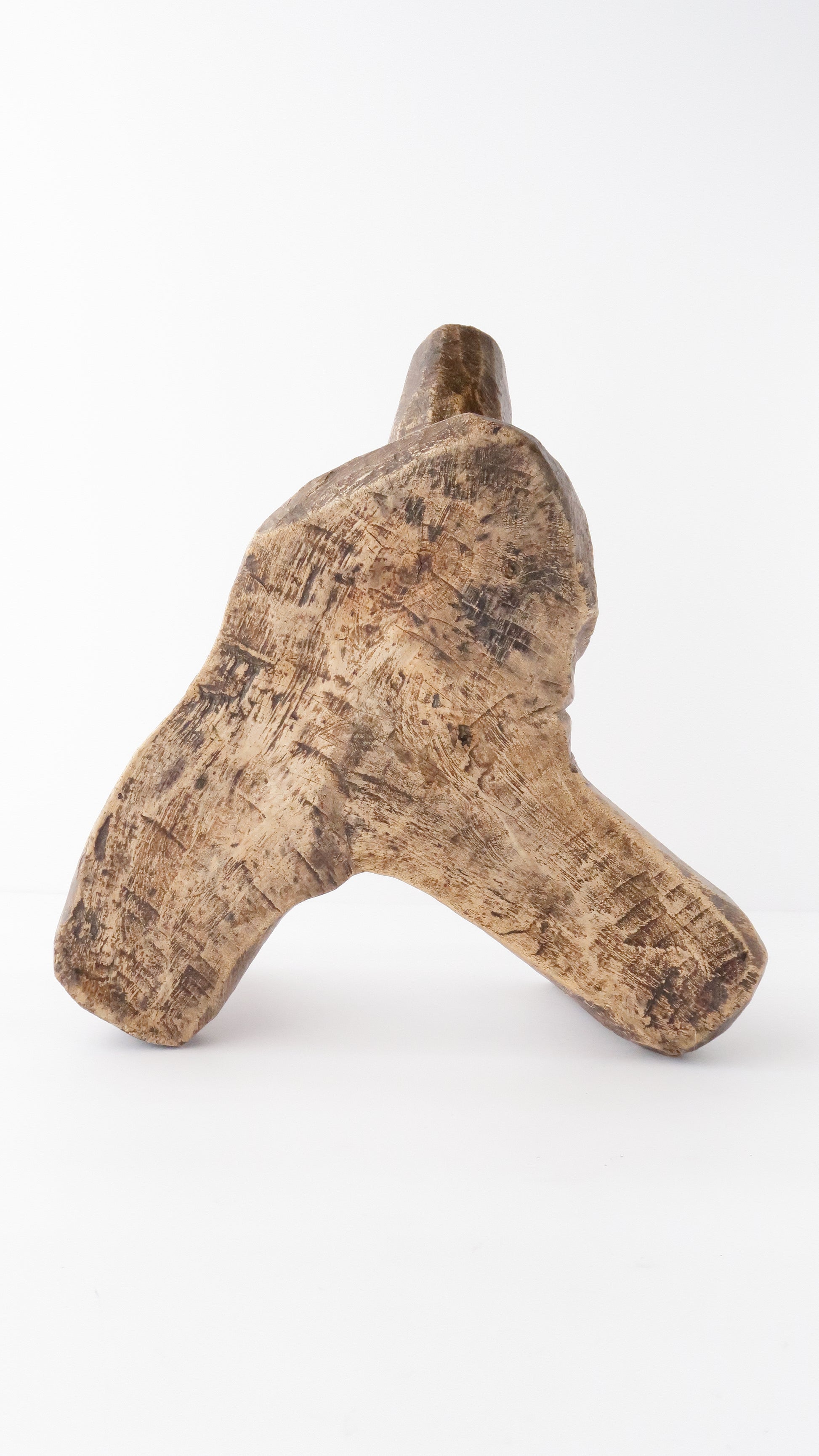 こちらは一刀彫りの三本足のスツールです。サイズの割にはとても軽いです。木の幹部分を彫るのではなく、枝の部分を使っているようです。そのため元々の木の自然な曲線を活かした形になっています。