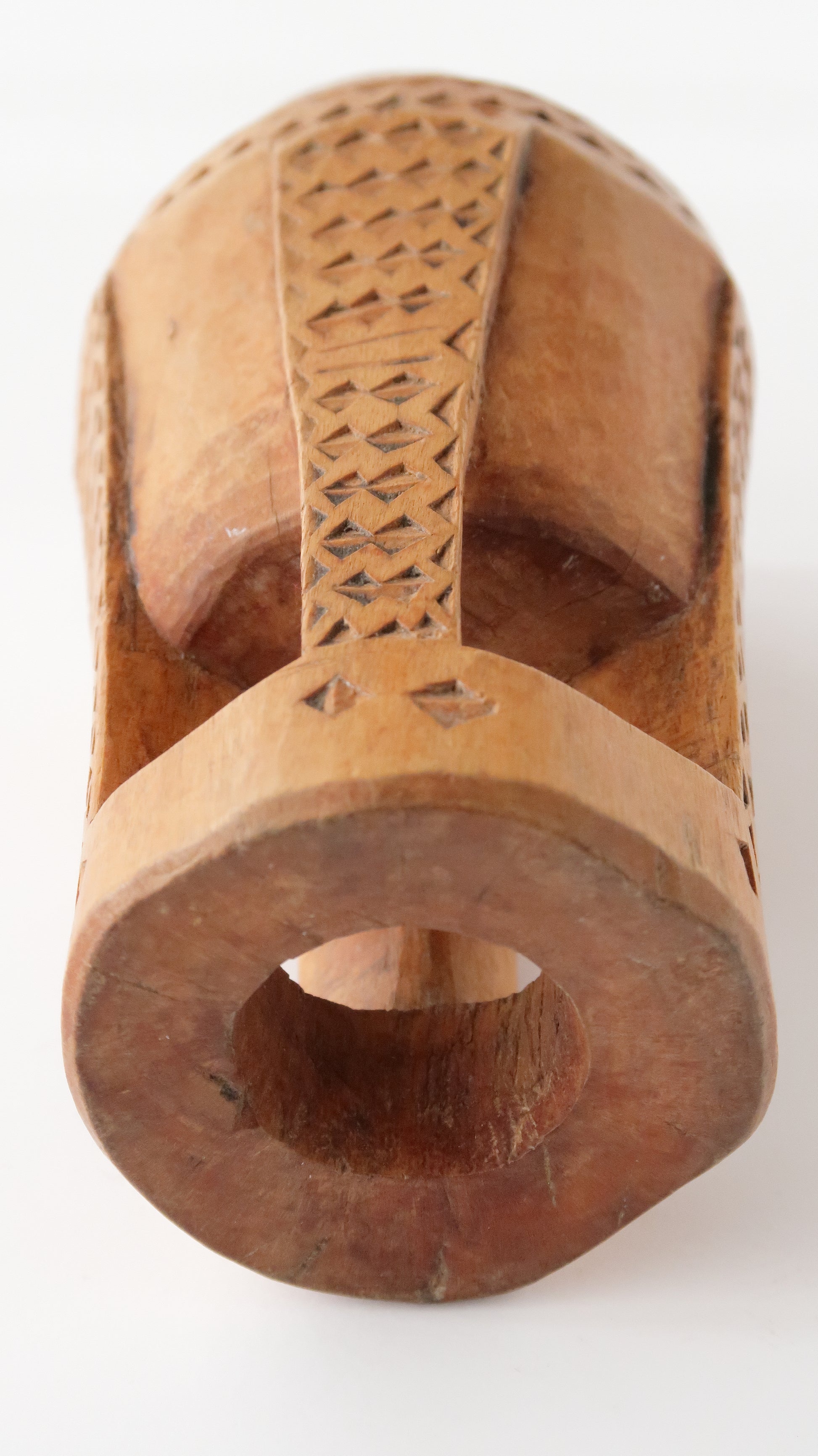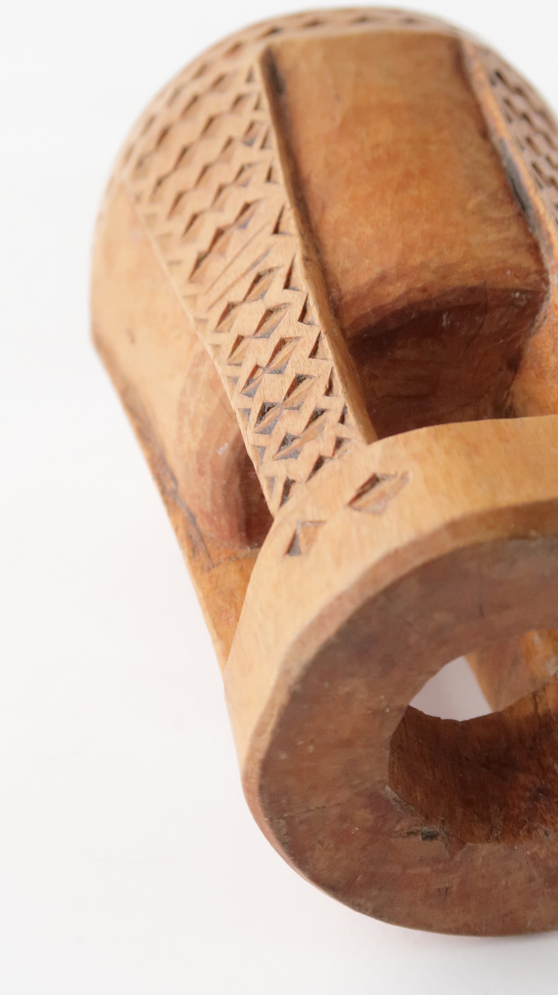 こちらはエチオピア南部に住むボラナの人たちのコーヒー豆潰しです。小ぶりですが、焙煎したコーヒーを粉状にするための豆潰しです。潰そうとすると上に豆が上がってくるのですが、丁寧にゆっくりと潰していきます。